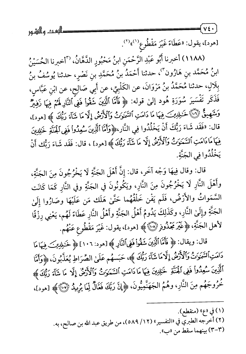 1188 - أَخْبَرَنَا أَبُو عَبْدِ الرَّحْمَنِ بْنُ مَحْبُور الدَّهَّانُ، أخبرنا الْحُسَيْنُ بْنُ مُحَمَّدِ بْنِ هَارُونَ، حدثنا أَحْمَدُ بْنُ مُحَمَّدِ بْنِ نَصْرٍ، حدثنا يُوسُفُ بْنُ بِلَالٍ، حدثنا مُحَمَّدُ بْنُ مَرْوَانَ، عَنِ الْكَلْبِيِّ، عَنْ أَبِي صَالِحٍ، عَنِ ابْنِ عَبَّاسٍ، فَذَكَرَ تَفْسِيرَ سُورَةِ هُودٍ إِلَى قَوْلِهِ: {فَأَمَّا الَّذِينَ شَقُوا فَفِي النَّارِ لَهُمْ فِيهَا زَفِيرٌ وَشَهِيقٌ، خَالِدِينَ فِيهَا مَا دَامَتِ السَّمَوَاتُ وَالْأَرْضُ إِلَّا مَا شَاءَ رَبُّكَ}، قَالَ: فَقَدْ شَاءَ رَبُّكَ أَنْ يَخْلُدُوا فِي النَّارِ، {وَأَمَّا الَّذِينَ سُعِدُوا فَفِي الْجَنَّةِ خَالِدِينَ فِيهَا مَا دَامَتِ السَّمَوَاتُ وَالْأَرْضُ إِلَّا مَا شَاءَ رَبُّكَ}، قَالَ: فَقَدْ شَاءَ رَبُّكَ أَنْ يَخْلُدُوا فِي الْجَنَّةِ.