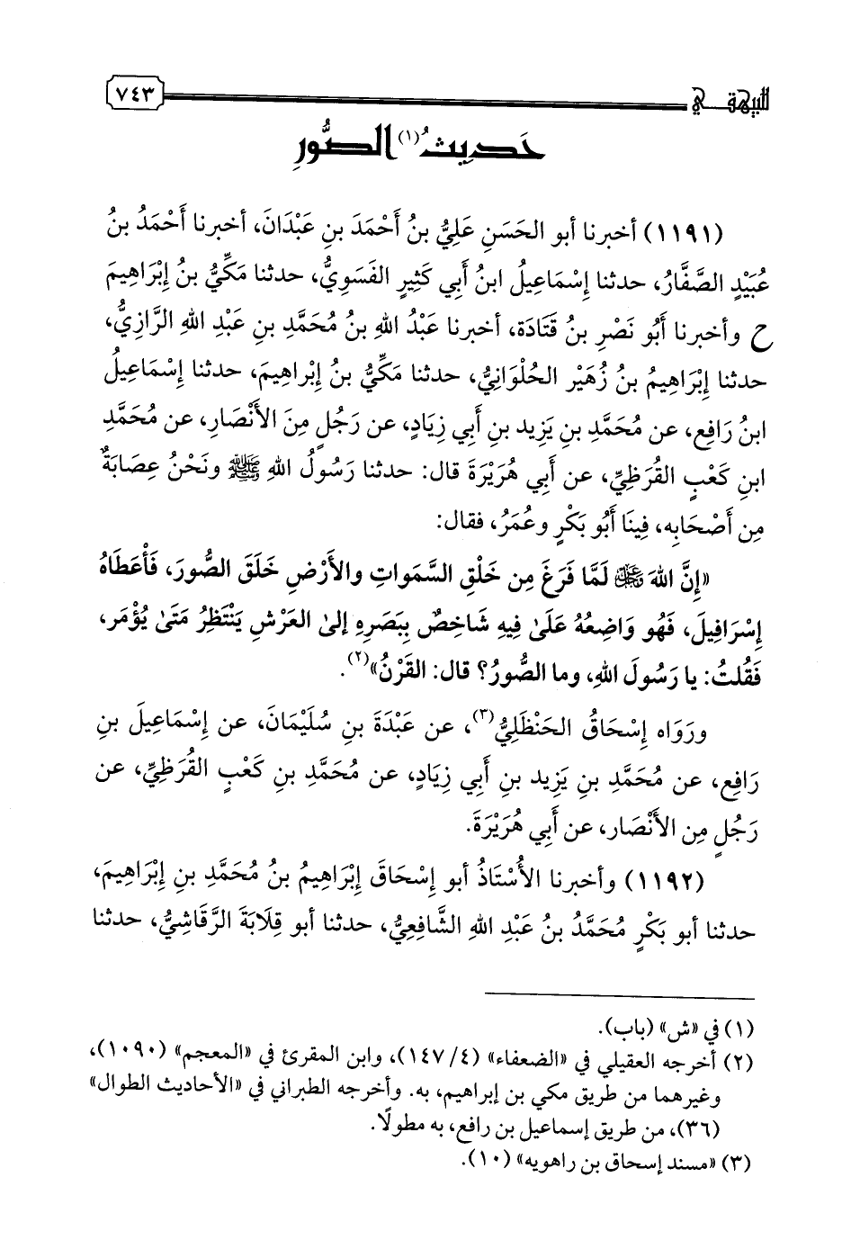 وَأَخْبَرَنَا أَبُو نَصْرِ بْنُ قَتَادَةَ، أخبرنا عَبْدُ اللَّهِ بْنُ مُحَمَّدِ بْنِ عَبْدِ اللَّهِ الرَّازِيُّ، حدثنا إِبْرَاهِيمُ بْنُ زُهَيْرٍ الْحُلْوَانِيُّ، حدثنا مَكِّيُّ بْنُ إِبْرَاهِيمَ، حدثنا إِسْمَاعِيلُ بْنُ رَافِعٍ، عَنْ مُحَمَّدِ بْنِ يَزِيدَ بْنِ أَبِي زِيَادٍ، عَنْ رَجُلٍ مِنَ الْأَنْصَارِ، عَنْ مُحَمَّدِ بْنِ كَعْبٍ الْقُرَظِيِّ، عَنْ أَبِي هُرَيْرَةَ قَالَ: حَدَّثَنَا رَسُولُ اللَّهِ صَلَّى اللهُ عَلَيْهِ وَسَلَّمَ وَنَحْنُ عِصَابَةٌ مِنْ أَصْحَابِهِ، وفِينَا أَبُو بَكْرٍ وَعُمَرُ، فَقَالَ: «إِنَّ اللَّهَ عَزَّ وَجَلَّ لَمَّا فَرَغَ مِنْ خَلْقِ السَّمَوَاتِ وَالْأَرْضِ خَلَقَ الصُّورَ، فَأَعْطَاهُ إِسْرَافِيلَ، فَهُوَ وَاضِعُهُ عَلَى فِيهِ شَاخِصٌ بِبَصَرِهِ إِلَى الْعَرْشِ يَنْتَظِرُ مَتَى يُؤْمَرُ»، فقُلْتُ: يَا رَسُولَ اللَّهِ: ومَا الصُّورُ؟ قَالَ: «الْقَرْنُ»