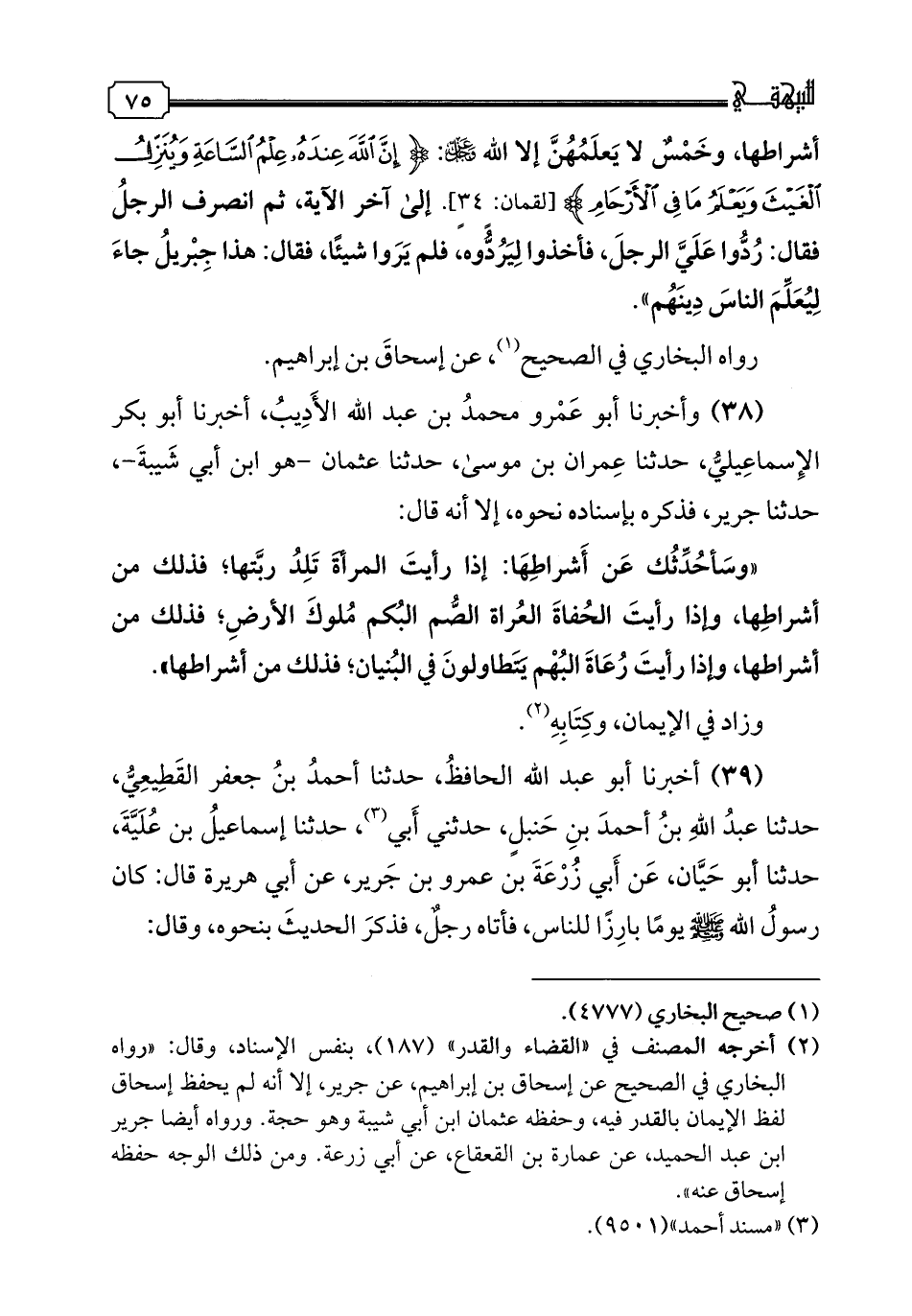 39 - أخبرنا أبو عبد الله الحافظ، حدثنا أحمد بن جعفر القطيعي، حدثنا عبد الله بن أحمد بن حنبل، حدثني أبي، حدثنا إسماعيل بن علية، حدثنا أبو حيان، عن أبي زرعة بن عمرو بن جرير، عن أبي هريرة قال: كان رسول الله صلى الله عليه وسلم يوما بارزا للناس، فأتاه رجل، فذكر الحديث بنحوه، وقال: " يا رسول الله، متى الساعة؟ قال: ما المسئول عنها بأعلم من السائل، ولكني سأحدثك عن أشراطها، إذا ولدت المرأة ربتها، فذلك من أشراطها، وإذا كانت العراة الحفاة رؤوس الناس، فذلك من أشراطها، وإذا تطاول رعاء البهم في البنيان، فذلك من أشراطها، في خمس لا يعلمهن إلا الله". وذكر باقي الحديث بنحو حديث جرير. رواه الخاري في الصحيح، عن مسدد، ورواه مسلم، عن زهير بن حرب، وغيره، كلهم عن ابن علية، وقد مضى في هذا رواية عمر بن الخطاب رضي الله عنه. وقوله: "سأحدثك عن أشراطها"، يريد علاماتها، وكذلك قوله: "فقد جاء أشراطها" أي ما يتقدمها من العلامات الدالة على قرب حينها، وقوله: "إذا ولدت الأمة ربتها" معناه، اتساع الإسلام واستيلاء أهله على بلاد الكفر، وسبي ذراريهم، فإذا ملك الرجل منهم الجارية فاستولدها، كان الولد منها بمنزلة ربها، لأنه ولد سيدها، وكذلك المعنى فيما ذكر بعده اتساع دين الإسلام وافتتاح البلدان، حتى يسكنها الرعاء وأصحاب البوادي، فيتطاولون عند ذلك في البنيان، وهذا التفسير من قول أبي سليمان الخطابي.
