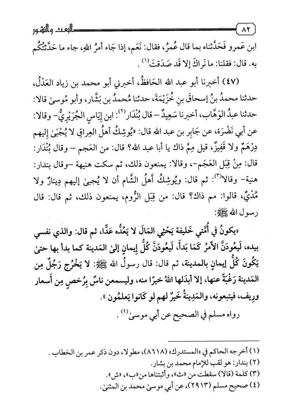 47 - أخبرنا أبو عبد الله الحافظ، أخبرني أبو محمد بن زياد العدل، حدثنا محمد بن إسحاق بن خزيمة، حدثنا محمد بن بشار، وأبو موسى قالا: حدثنا عبد الوهاب، أخبرنا سعيد -قال بندار: ابن إياس الجريري -وقالا: عن أبي نضرة، عن جابر بن عبد الله قال: "يوشك أهل العراق لا يجبى إليهم درهم ولا قفيز، قيل مم ذاك يا أبا عبد الله؟ قال: من العجم - وقال بندار: قال: من قبل العجم-، وقالا: يمنعون ذلك، ثم سكت هنيهة- وقال بندار: هنية- وقالا: ثم قال: ويوشك أهل الشام أن لا تجبى إليهم دينار ولا مدي، قالوا: مم ذاك؟ قال: من قبل الروم، يمنعون ذلك، ثم قال: قال رسول الله صلى الله عليه وسلم: "يكون في أمتي خليفة يحثي المال لا يعده عدا، ثم قال: والذي نفسي بيده، ليعودون الأمر كما بدأ، ليعودن كل إيمان إلى المدينة كما بدأ بها حتى يكون كل إيمان بالمدينة، ثم قال: قال رسول الله صلى الله عليه وسلم: لا يخرج رجل من المدينة رغبة عنها، إلا أبدلها الله خيرا منه، وليسمعن ناس برخص من أسعار وريف، فيتبعونه، والمدينة خير لهم لو كانوا يعلمون". رواه مسلم في الصحيح عن أبي موسى.