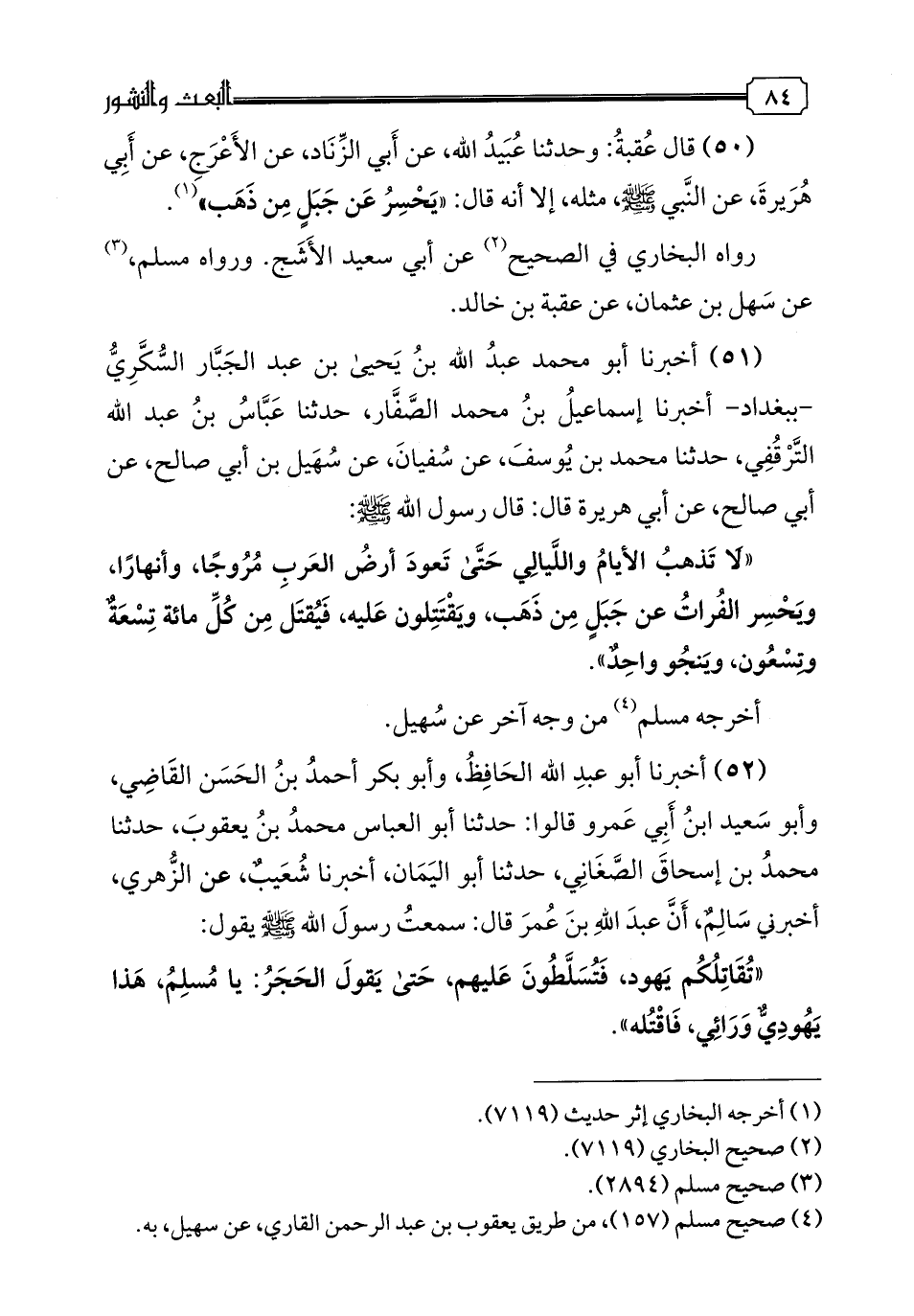 51 - أخبرنا أبو محمد عبد الله بن يحيى بن عبد الجبار السكري -ببغداد- أخبرنا إسماعيل بن محمد الصفار، حدثنا عباس بن عبد الله الترقفي، حدثنا محمد بن يوسف، عن سفيان، عن سهيل بن أبي صالح، عن أبي صالح، عن أبي هريرة قال: قال رسول الله صلى الله عليه وسلم: "لا تذهب الأيام والليالي حتى تعود أرض العرب مروجا، وأنهارا، ويحسر الفرات عن جبل من ذهب، ويقتتلون عليه، فيقتل من كل مائة تسعة وتسعون، وينجو واحد". أخرجه مسلم من وجه آخر عن سهيل.