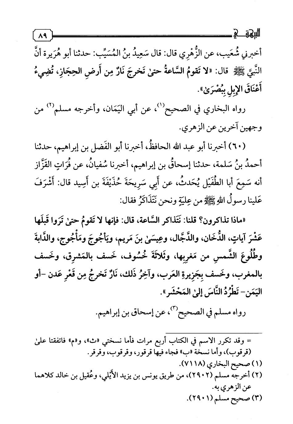 60 - أخبرنا أبو عبد الله الحافظ، أخبرنا أبو الفضل بن إبراهيم، حدثنا أحمد بن سلمة، حدثنا إسحاق بن إبراهيم، أخبرنا سفيان، عن فرات القزاز أنه سمع أبا الطفيل يحدث، عن أبي سريحة حذيفة بن أسيد قال: أشرف علينا رسول الله صلى الله عليه وسلم من علية ونحن نتذاكر فقال: "ماذا تذاكرون؟ قلنا: نتذاكر الساعة، قال: فإنها لا تقوم حتى تروا قبلها عشر آيات، الدخان، والدجال، وعيسى بن مريم، ويأجوج ومأجوج، والدابة وطلوع الشمس من مغربها، وثلاثة خسوف، خسف بالمشرق، وخسف بالمغرب، وخسف بجزيرة العرب، وآخر ذلك، نار تخرج من قعر عدن -أو اليمن- تطرد الناس إلى المحشر". رواه مسلم في الصحيح، عن إسحاق بن إبراهيم.