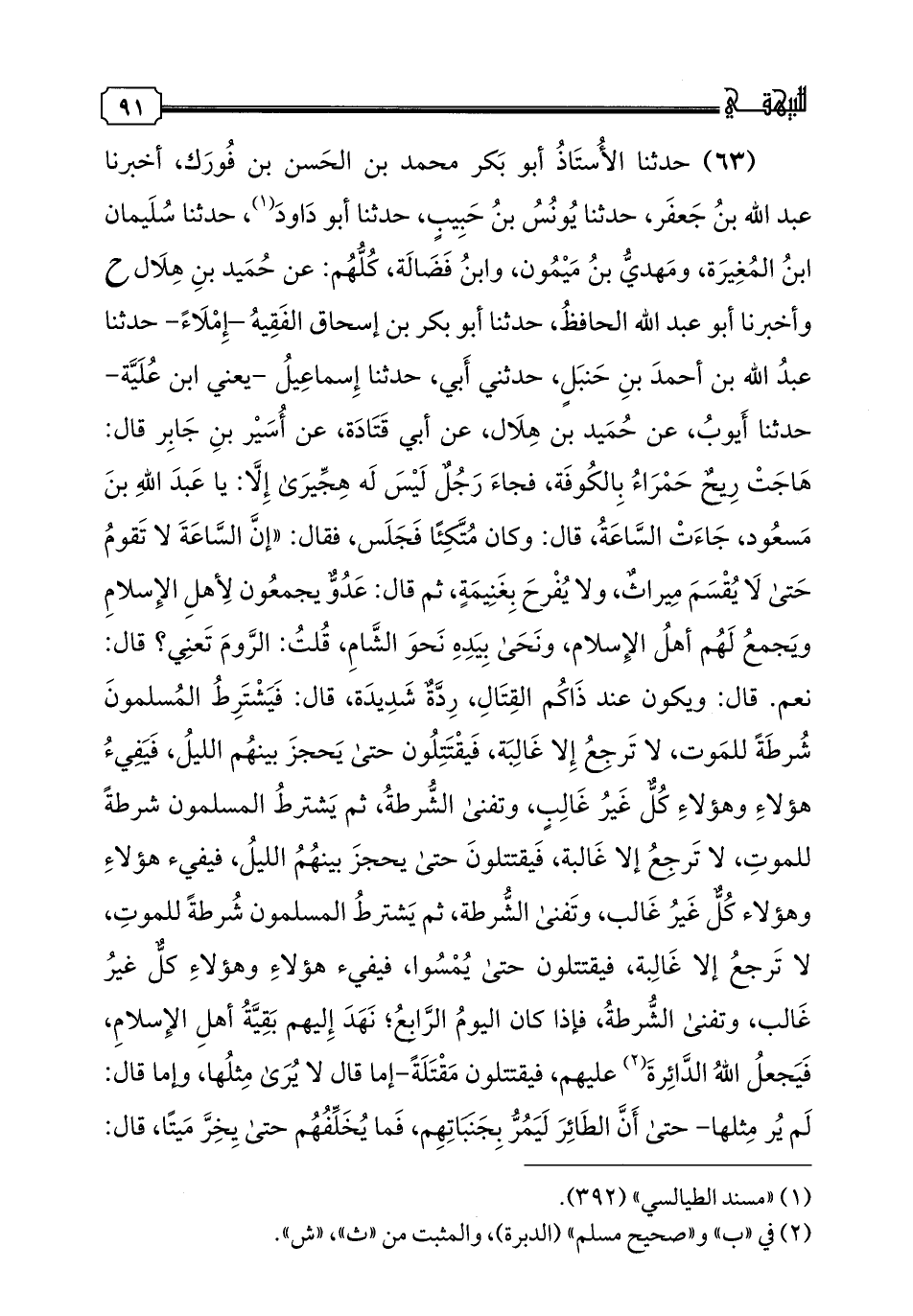 63 - حدثنا الأستاذ أبو بكر محمد بن الحسن بن فورك، أخبرنا عبد الله بن جعفر، حدثنا يونس بن حبيب، حدثنا أبو داود، حدثنا سليمان بن المغيرة، ومهدي بن ميمون، وابن فضالة، كلهم: عن حميد بن هلال ح وأخبرنا أبو عبد الله الحافظ، حدثنا أبو بكر بن إسحاق الفقيه -إملاء- حدثنا عبد الله بن أحمد بن حنبل، حدثني أبي، حدثنا إسماعيل -يعني ابن علية- حدثنا أيوب، عن حميد بن هلال، عن أبي قتادة، عن أسير بن جابر قال: هاجت ريح حمراء بالكوفة، فجاء رجل ليس له هجيري إلا: يا عبد الله بن مسعود، جاءت الساعة، قال: وكان متكئا فجلس، فقال: "إن الساعة لا تقوم حتى لا يقسم ميراث، ولا يفرح بغنيمة، ثم قال: عدو يجمعون لأهل الإسلام ويجمع لهم أهل الإسلام، ونحى بيده نحو الشام، قلت: الروم تعني؟ قال: نعم. قال: ويكون عند ذاكم القتال، ردة شديدة، قال: فيشترط المسلمون شرطة للموت، لا ترجع إلا غالبة، فيقتتلون حتى يحجز بينهم الليل، فيفيء هؤلاء وهؤلاء كل غير غالب، وتفنى الشرطة، ثم يشترط المسلمون شرطة للموت، لا ترجع إلا غالبة، فيقتتلون حتى يحجز بينهم الليل، فيفيء هؤلاء وهؤلاء كل غير غالب، وتفنى الشرطة، ثم يشترط المسلمون شرطة للموت، لا ترجع إلا غالبة، فيقتتلون حتى يمسوا، فيفيء هؤلاء وهؤلاء كل غير غالب، وتفنى الشرطة، فإذا كان اليوم الرابع، نهد إليهم بقية أهل الإسلام، فيجعل الله الدائرة عليهم، فيقتتلون مقتلة -إما قال لا يرى مثلها، وإما قال: لم ير مثلها- حتى أن الطائر ليمر يجنباتهم، فما يخلفهم حتى يخر ميتا، قال: فيتعاد بنو الأب كانوا مائة، فلا يجدون بقي منهم إلا الرجل الواحد، فبأي غنيمة يفرح، أو أي ميراث يقسم. قال: بينا هم كذلك، إذ سمعوا ببأس هو أكبر من ذلك قال: جاءهم الصريخ، إن الدجال قد خلفهم في ذراريهم، فيرفضون ما في أيديهم، ويقبلون، فيبعثون عشرة فوارس طليعة، قال رسول الله صلى الله عليه وسلم: وإني لأعلم أسماءهم، وأسماء آبائهم، وألوان خويلهم، هم خير فوارس على ظهر الأرض يومئذ -أو قال: هم من خير فوارس على ظهر الأرض يومئذ -". هذا لفظ حديث إسماعيل بن علية، عن أيوب. رواه مسلم في الصحيح، عن أبي بكر بن أبي شيبة، وعلي بن حجر، عن إسماعيل، وعن شيبان بن فروخ، عن سليمان بن المغيرة.