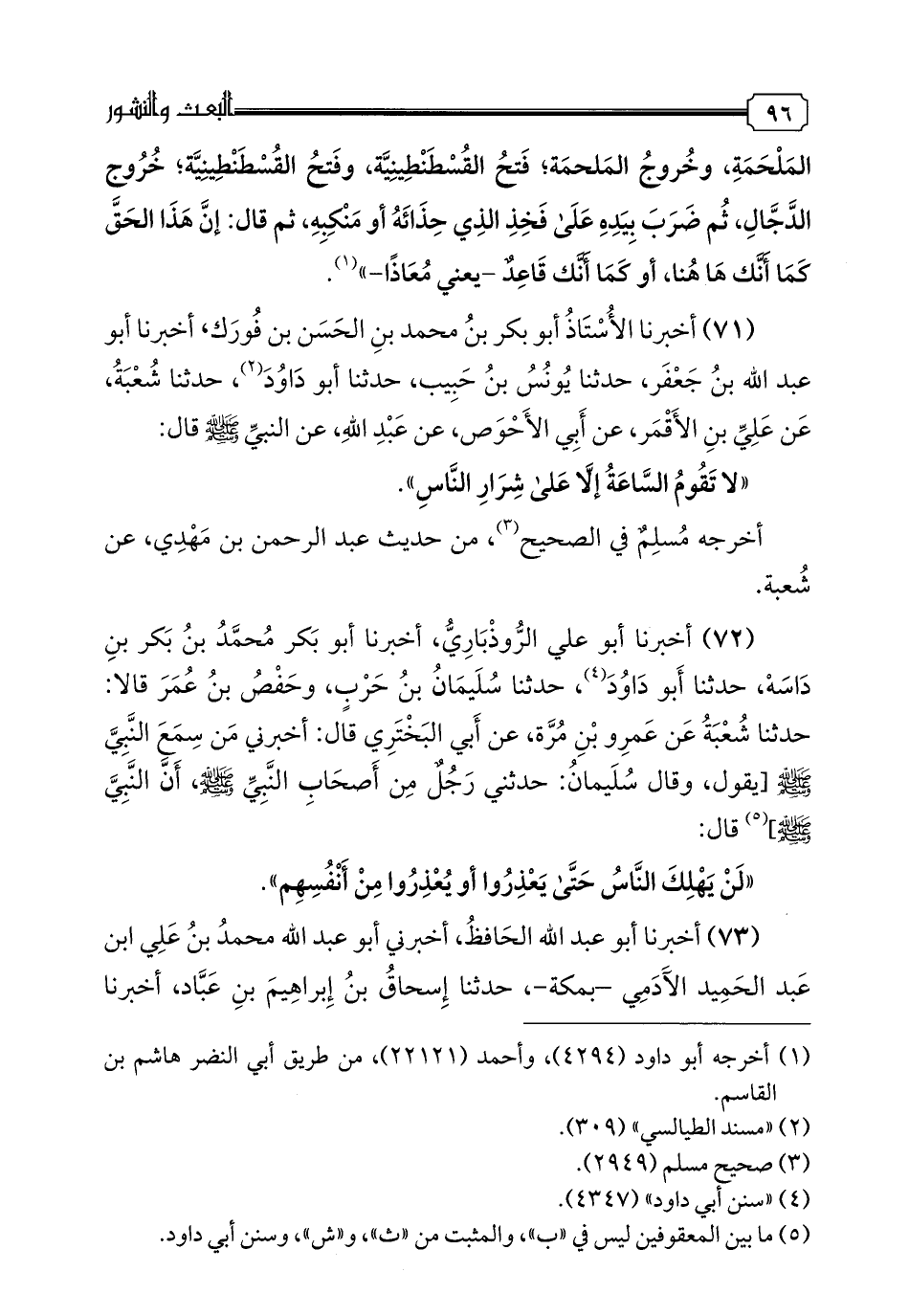 71 - أخبرنا الأستاذ أبو بكر بن محمد بن الحسن بن فورك، أخبرنا أبو عبد الله بن جعفر، حدثنا يونس بن حبيب، حدثنا أبو داود، حدثنا شعبة، عن علي بن الأقمر، عن أبي الأحوص، عن عبد الله، عن النبي صلى الله عليه وسلم قال: "لا تقوم الساعة إلا على شرار الناس". أخرجه مسلم في الصحيح، من حديث عبد الرحمن بن مهدي، عن شعبة.