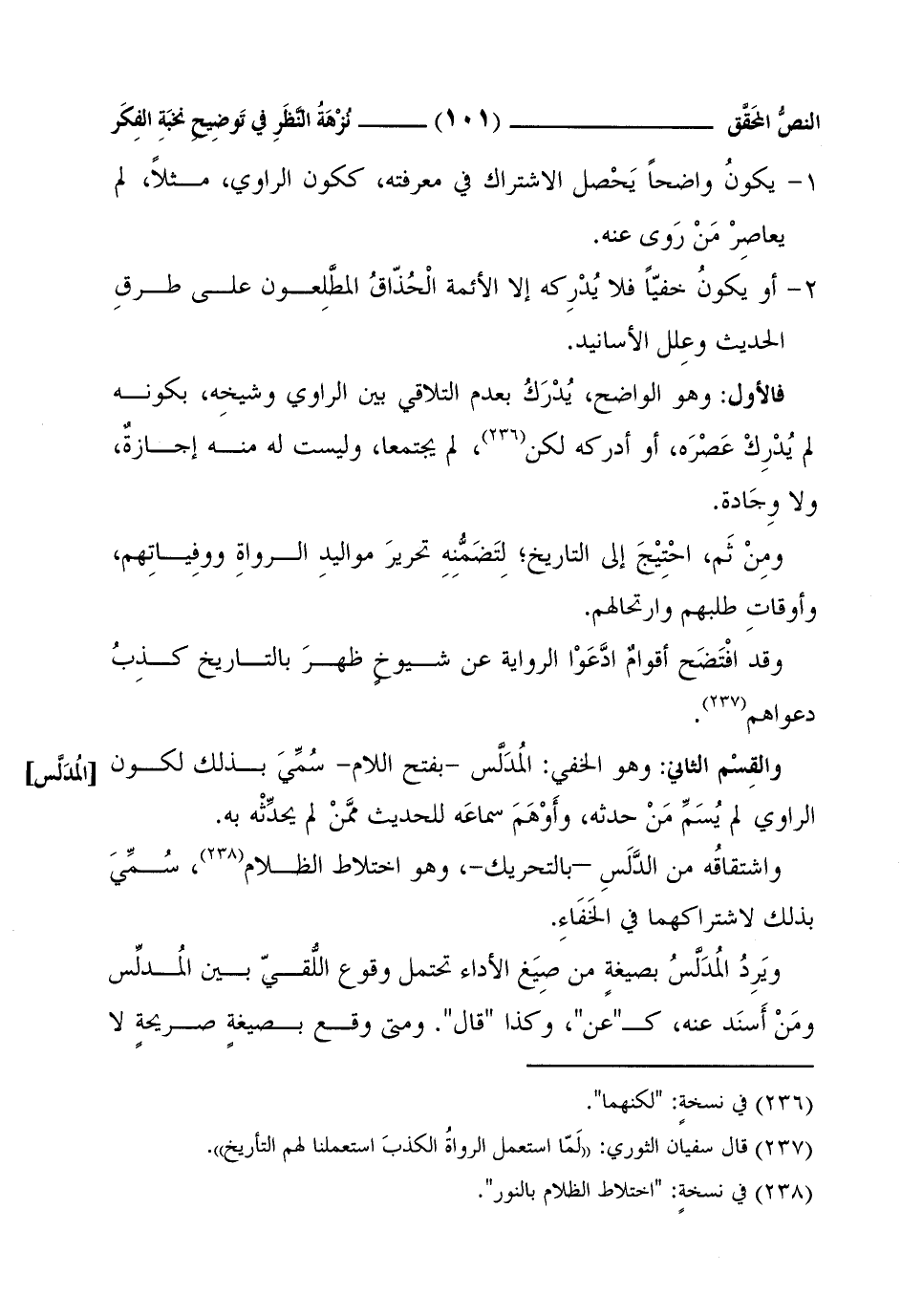 1 - يكونُ واضحاً يَحْصل الاشتراك في معرفته، ككون الراوي، مثلاً، لم يعاصِرْ مَنْ رَوى عنه.