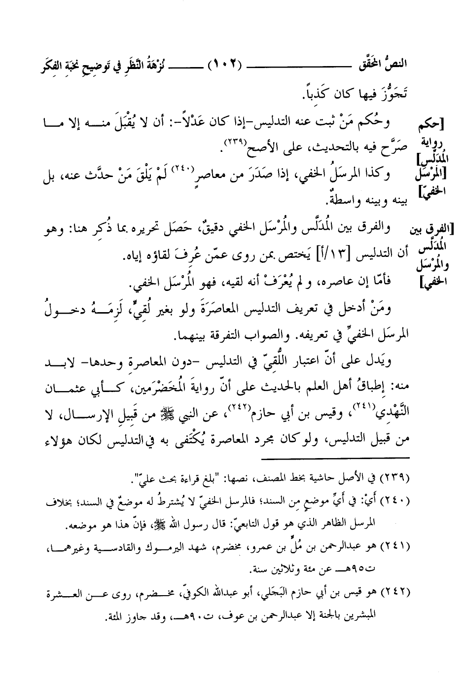 ويَدل على أنّ اعتبار اللُّقِيّ في التدليس -دون المعاصرةِ وحدها- لابد منه: إِطباقُ أهل العلم بالحديث على أنّ روايةَ الْمُخَضْرَمين، كأبي عثمان النَّهْدِي (¬3)، وقيس بن أبي حازم (¬4)، عن النبي - صلى الله عليه وسلم - من قَبِيلِ الإرسال، لا من قبيل التدليس، ولو كان مجرد المعاصرة يُكْتَفى به في التدليس لكان هؤلاء