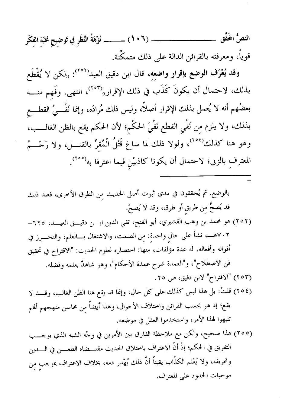 (¬1) هو محمد بن وهب القشيري، أبو الفتح، تقي الدين ابن دقيق العيد، 625 - 702 هـ، نشأ على حالٍ واحدةٍ: مِن الصمت، والاشتغال بالعلم، والتحرز في أقواله وأفعاله، له عدة مؤلفات، منها: اختصاره لعلوم الحديث: "الاقتراح في تحقيق فن الاصطلاح"، و"العمدة شرح عمدة الأحكام"، وهو شاهدٌ بعلمه وفضله.