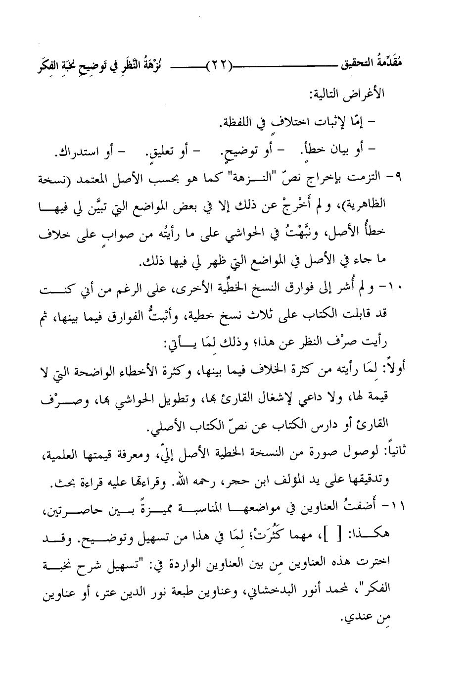 11 - أَضفتُ العناوين في مواضعها المناسبة مميزةً بين حاصرتين، هكذا: []، مهما كَثُرَتْ؛ لِمَا في هذا من تسهيل وتوضيح. وقد اخترت هذه العناوين مِن بين العناوين الواردة في: "تسهيل شرح نخبة الفكر"، لمحمد أنور البدخشاني، وعناوين طبعة نور الدين عتر، أو عناوين مِن عندي.