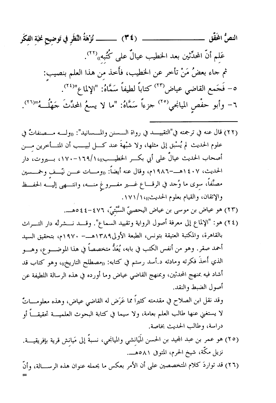 وقد نقل ابن الصلاح في مقدمته كثيراً مما عَرَض له القاضي عياض، وهذه معلوماتٌ لا يستغني عنها طالب العلم بعامة، ولا سيما في كتابة البحوث العلمية تحقيقاً أو دراسة، وطالب الحديث بخاصة.