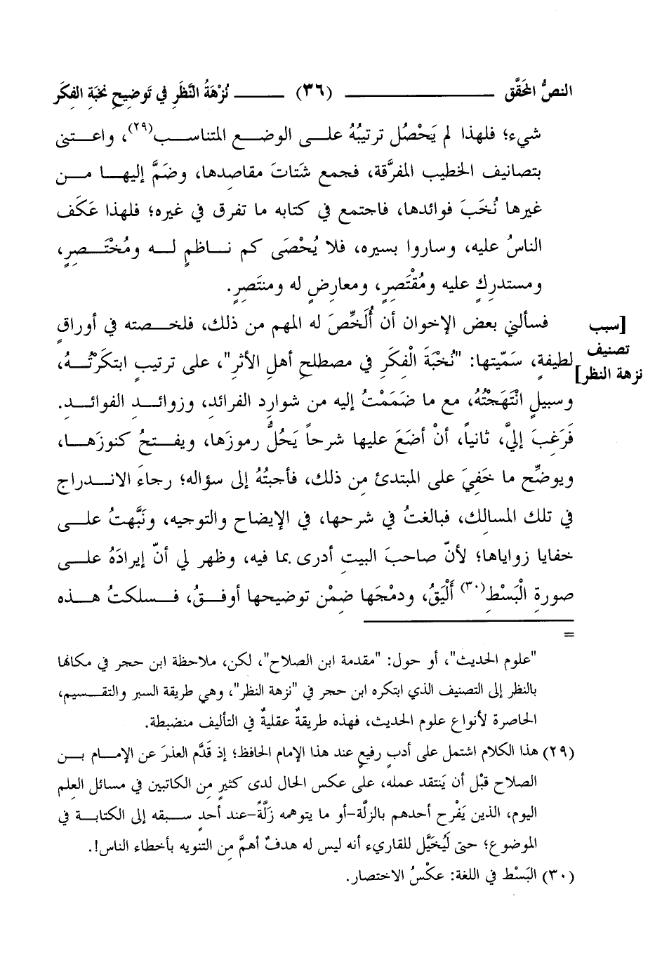 فسألني بعض الإخوان أن أُلَخِّصَ له المهم من ذلك، فلخصته في أوراقٍ لطيفةٍ، سَمّيتها: "نُخْبَةَ الْفِكَرِ في مصطلحِ أهلِ الأثرِ"، على ترتيبٍ ابتكَرْتُهُ، وسبيلٍ انْتَهَجْتُهُ، مع ما ضَمَمْتُ إليه من شوارِد الفرائدِ، وزوائدِ الفوائدِ. فَرَغِبَ إليَّ، ثانياً، أنْ أضَعَ عليها شرحاً يَحُلُّ رموزَها، ويفتحُ كنوزَها، ويوضِّح ما خَفِيَ على المبتدئ مِن ذلك، فأجبتُهُ إلى سؤاله؛ رجاءَ الاندراج في تلك المسالِك، فبالغتُ في شرحها، في الإيضاح والتوجيه، ونَبَّهتُ على خفايا زواياها؛ لأنّ صاحبَ البيتِ أدرى بما فيه، وظهر لي أنّ إيرادَهُ على صورةِ الْبَسْطِ (¬2) أَلْيَقُ، ودمْجَها ضِمْن توضيحها أوفقُ، فسلكتُ هذه