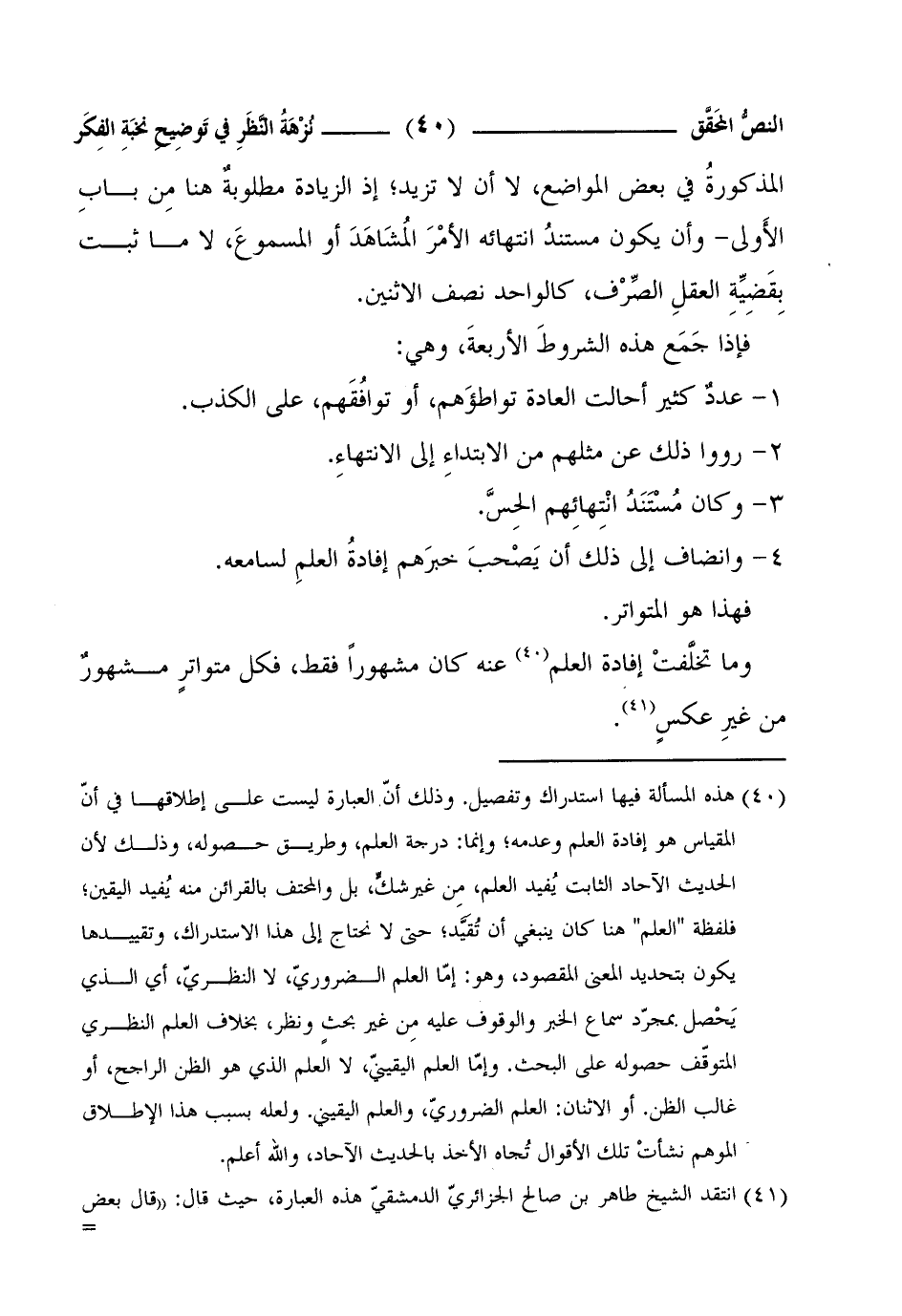 (¬2) انتقد الشيخ طاهر بن صالح الجزائريّ الدمشقيّ هذه العبارة، حيث قال: ((قال بعض الأفاضل: "كل متواتر مشهور، وليس كل مشهور متوتراً"، وذلك بعد أن عرّف كلاً منهما بما عرّفه به الجمهور، فهو مما يُنْتَقَدُ، قال بعضهم: ولعله أراد بالمشهور المعنى اللغويُّ، لا الاصطلاحيَّ))، "توجيه النظر إلى أُصول الأثر"، له، 1/ 112، ثم التمَسَ وجْهاً لقول ابن حجر. قلت: وفي هذا الاعتراض على الحافظ نظر؛ إذ كلامه مستقيمٌ لا إشكال فيه عندي، والله أعلم.