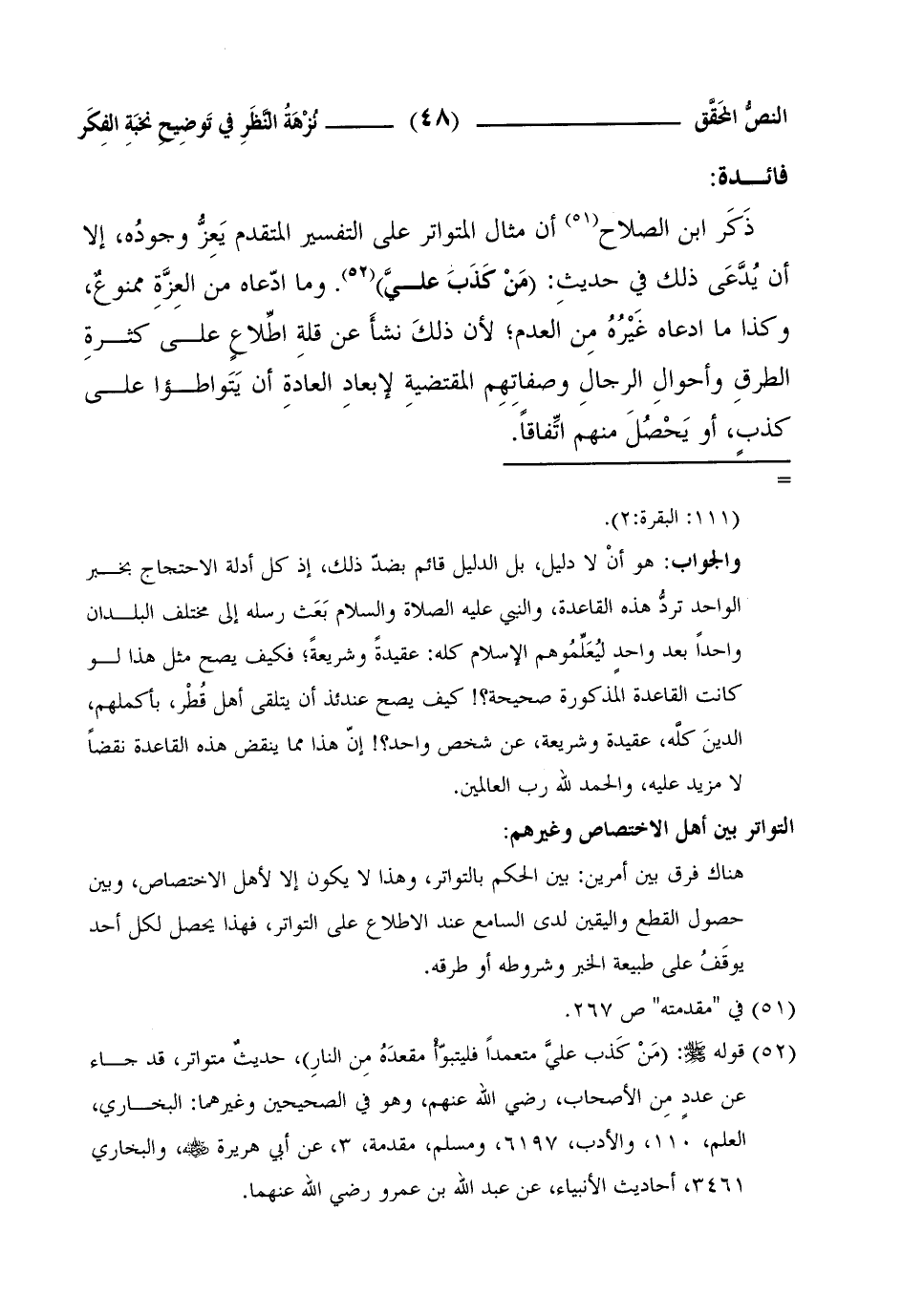 = والجواب: هو أنْ لا دليل، بل الدليل قائم بضدّ ذلك، إذ كل أدلة الاحتجاج بخبر الواحد تردُّ هذه القاعدة، والنبي عليه الصلاة والسلام بَعَث رسله إلى مختلف البلدان واحداً بعد واحدٍ ليُعَلِّمُوهم الإسلام كله: عقيدةً وشريعةً؛ فكيف يصح مثل هذا لو كانت القاعدة المذكورة صحيحة؟ ! كيف يصح عندئذ أن يتلقى أهل قُطْر، بأكملهم، الدينَ كلَّه، عقيدة وشريعة، عن شخص واحد؟ ! إنّ هذا مما ينقض هذه القاعدة نقضاً لا مزيد عليه، والحمد لله رب العالمين.