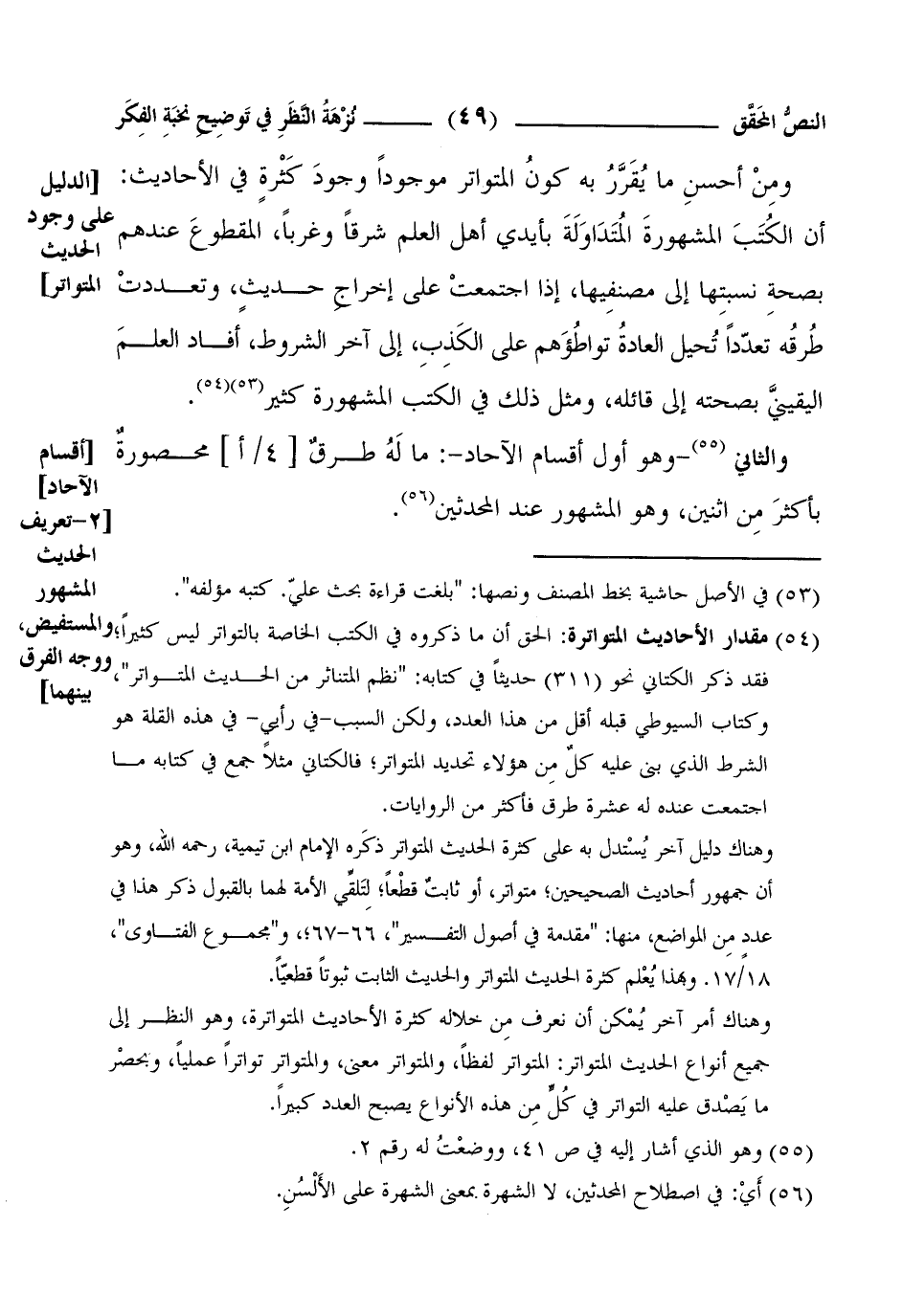 وهناك دليل آخر يُسْتدل به على كثرة الحديث المتواتر ذكَره الإمام ابن تيمية، رحمه الله، وهو أن جمهور أحاديث الصحيحين؛ متواتر، أو ثابتٌ قطْعاً؛ لِتَلقِّي الأمة لهما بالقبول ذكر هذا في عددٍ مِن المواضع، منها: "مقدمة في أصول التفسير"، 66 - 67؛ ، و"مجموع الفتاوى"، 18/ 17. وبهذا يُعْلم كثرة الحديث المتواتر والحديث الثابت ثبوتاً قطعيّاً.