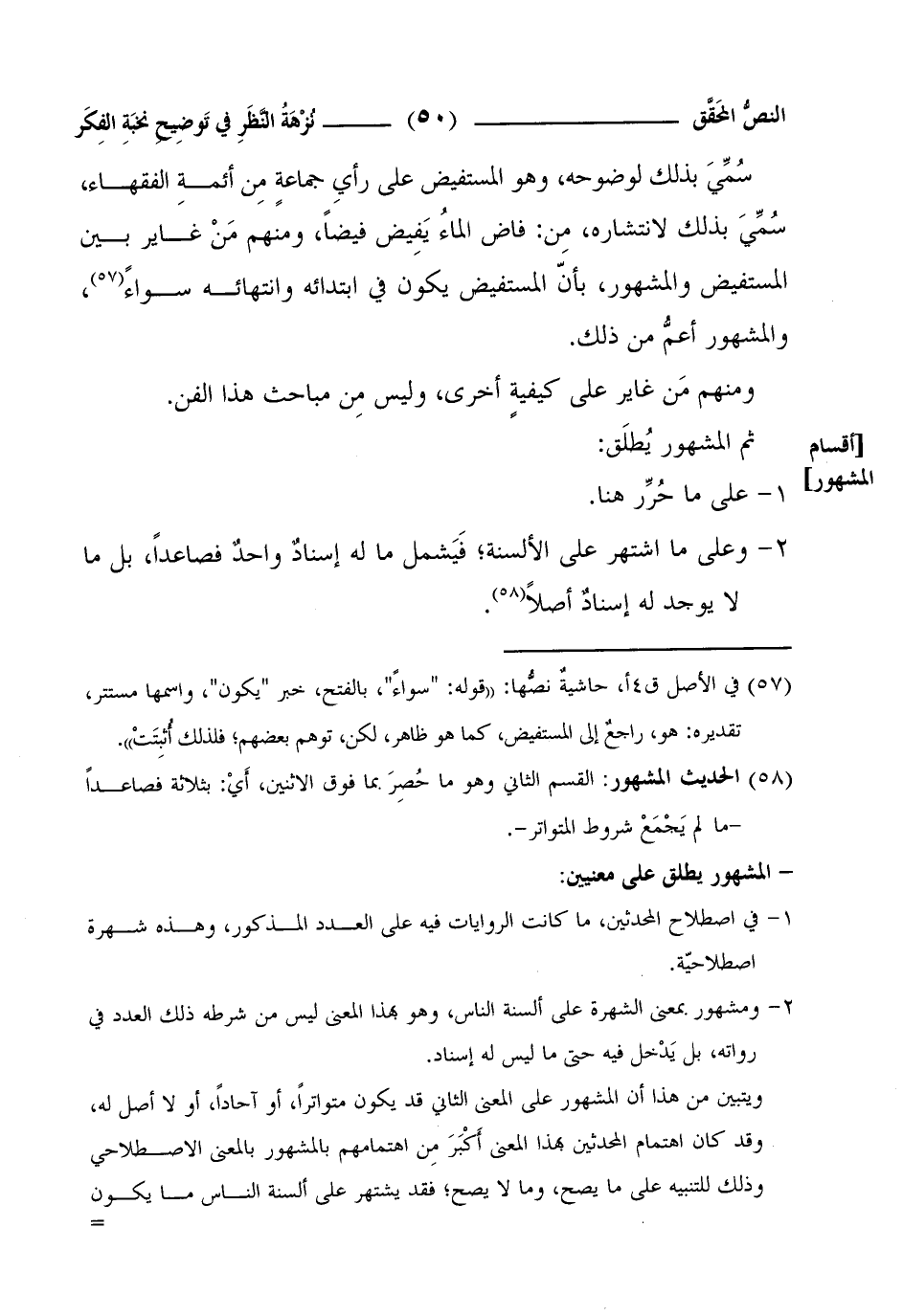2 - ومشهور بمعنى الشهرة على ألسنة الناس، وهو بهذا المعنى ليس من شرطه ذلك العدد في رواته، بل يَدْخل فيه حتى ما ليس له إسناد.