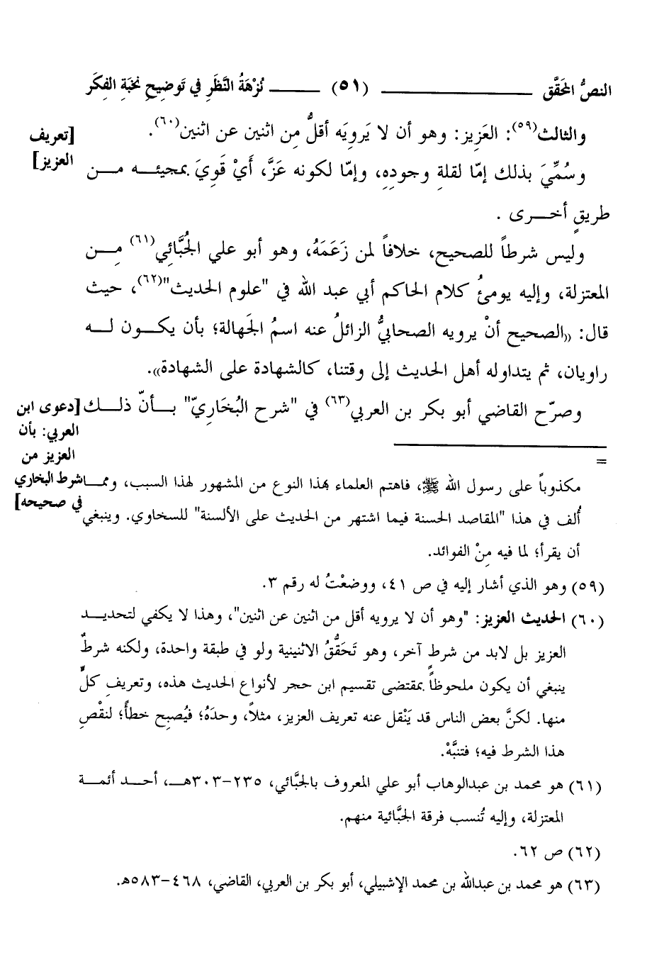 (¬2) الحديث العزيز: "وهو أن لا يرويه أقل من اثنين عن اثنين"، وهذا لا يكفي لتحديد العزيز بل لابد من شرطٍ آخر، وهو تَحَقُّقُ الاثنينية ولو في طبقة واحدة، ولكنه شرطٌ ينبغي أن يكون ملحوظاً بمقتضى تقسيم ابن حجر لأنواع الحديث هذه، وتعريفِ كلٍّ منها. لكنَّ بعض الناس قد يَنْقل عنه تعريف العزيز، مثلاً، وحدَهُ؛ فيُصبِح خطأً؛ لنقْصِ هذا الشرط فيه؛ فتنبَّهْ.