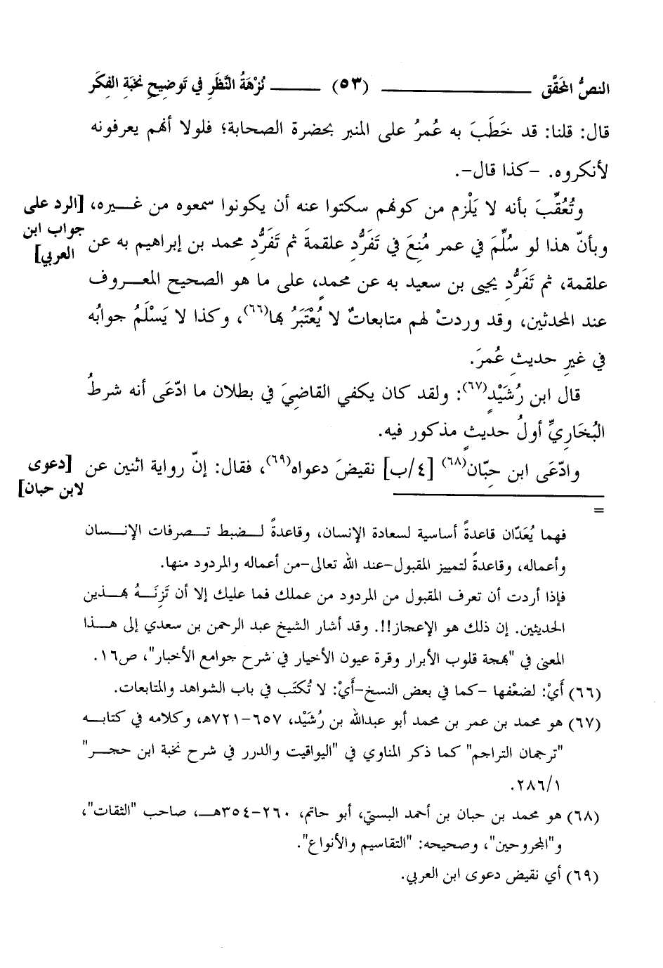 (¬2) هو محمد بن عمر بن محمد أبو عبدالله بن رُشَيْد، 657 - 721 هـ -، وكلامه في كتابه "ترجمان التراجم" كما ذكر المناوي في "اليواقيت والدرر في شرح نخبة ابن حجر" 1/ 286.