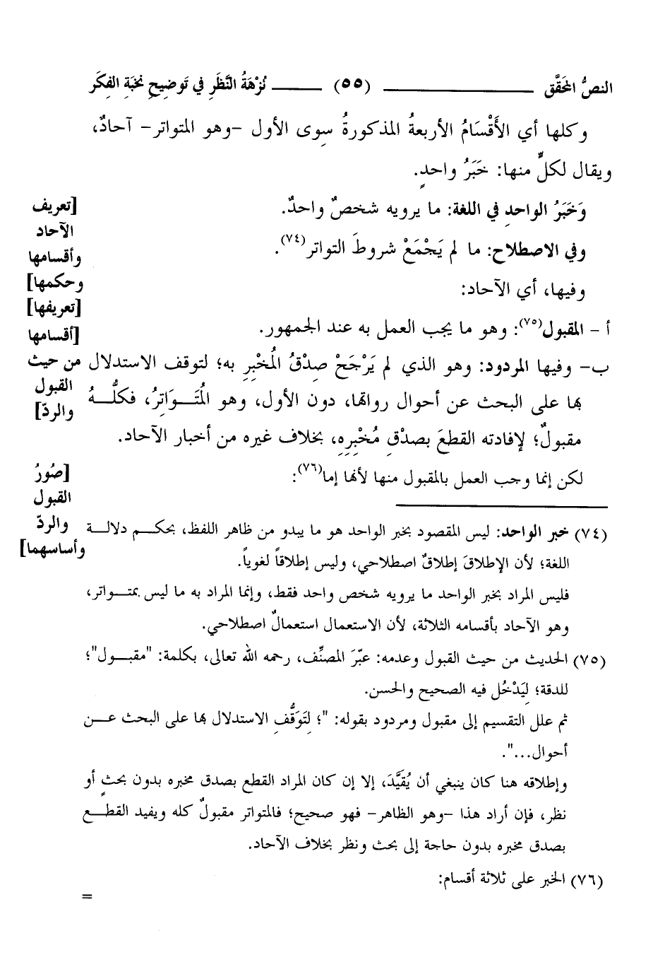 (¬1) خبر الواحد: ليس المقصود بخبر الواحد هو ما يبدو من ظاهر اللفظ، بحكم دلالة اللغة؛ لأن الإطلاقَ إطلاقٌ اصطلاحي، وليس إطلاقاً لغوياً.