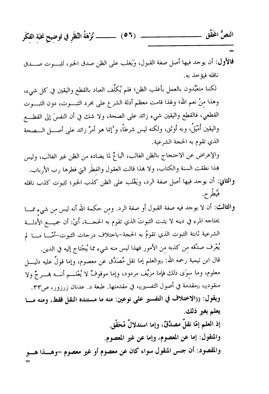 قال ابن تيمية رحمه الله: ((والعلم إما نقل مُصَدَّق عن معصوم، وإما قولٌ عليه دليل معلوم، وما سِوَى ذلك فإما مزيَّف مردود، وإما موقوفٌ لا يُعْلم أنه بهرجٌ ولا منقود))، ((مقدمة في أصول التفسير))، في مقدمتها. طبعة د. عدنان زرزور، ص 33.