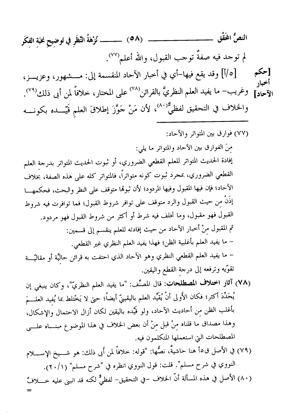 (¬2) آثار اختلاف المصطلحات: قال المصنِّف: "ما يفيد العلم النظريّ"، وكان ينبغي إن يُحَدِّدَ أكثر؛ فكان الأَولى أنْ يُقَيِّد العلم باليقينيّ أيضاً؛ حتى لا يَخْتلط بما يُفِيد العلمَ بأغلب الظن مِن أحاديث الآحاد، ولو قَيَّده باليقين لكان أزال الاحتمال والإشكال، وهذا مصداق ما قلناه مِنْ قبل مِنْ أن بعض الخلاف في هذا الموضوع مبناه على المصطلحات التي استعملها المتكلمون فيه.