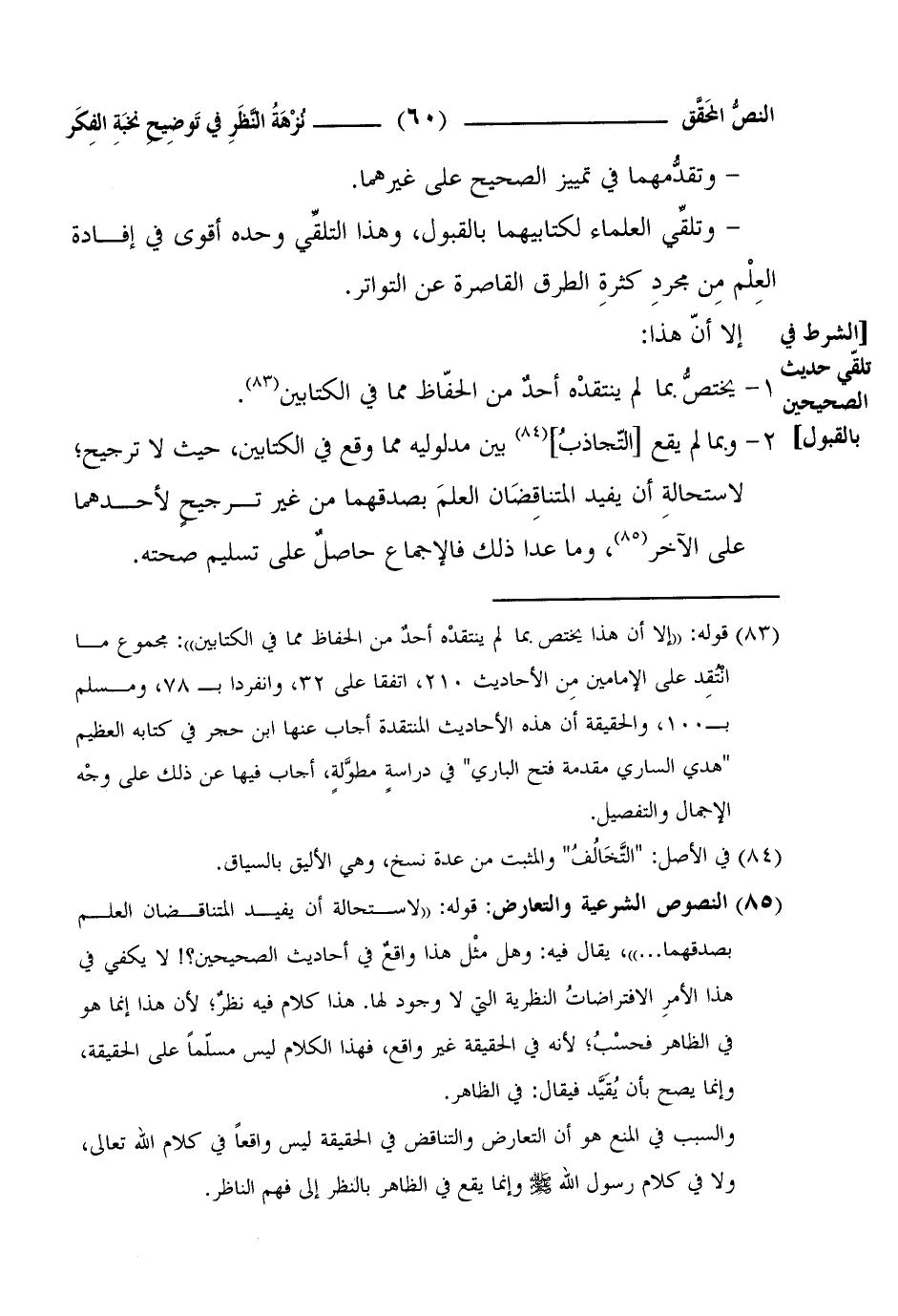(¬1) قوله: ((إلا أن هذا يختص بما لم ينتقدْه أحدٌ من الحفاظ مما في الكتابين)): مجموع ما انْتُقِد على الإمامين مِن الأحاديث 210، اتفقا على 32، وانفردا بـ 78، ومسلم بـ 100، والحقيقة أن هذه الأحاديث المنتقدة أجاب عنها ابن حجر في كتابه العظيم "هدي الساري مقدمة فتح الباري" في دراسةٍ مطوَّلةٍ، أجاب فيها عن ذلك على وجْه الإجمال والتفصيل.
