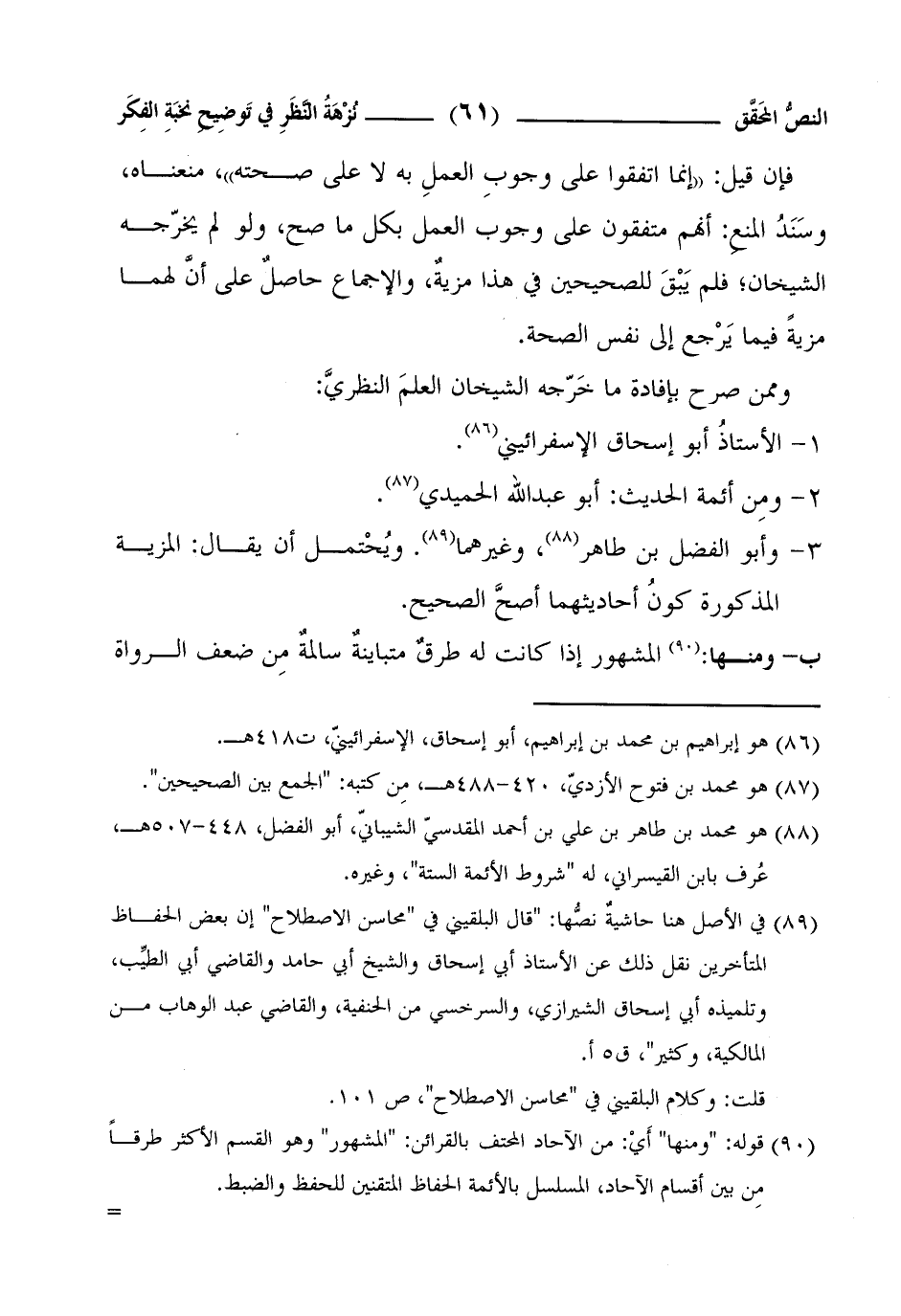 (¬4) في الأصل هنا حاشيةٌ نصُّها: "قال البلقيني في "محاسن الاصطلاح" إن بعض الحفاظ المتأخرين نقل ذلك عن الأستاذ أبي إسحاق والشيخ أبي حامد والقاضي أبي الطيِّب، وتلميذه أبي إسحاق الشيرازي، والسرخسي من الحنفية، والقاضي عبد الوهاب من المالكية، وكثير"، ق 5 أ.