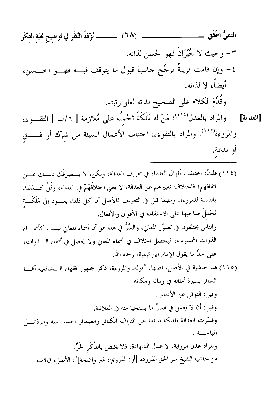 (¬1) قلتُ: اختلفت أقوال العلماء في تعريف العدالة، ولكن، لا يصرفْك ذلك عن اتفاقهم؛ فاختلاف تعبيرهم عن العدالة، لا يعني اختلافَهُمْ في العدالة، وقُلْ كذلك بالنسبة للمروءة. ومهما قيل في التعريف فالأصل أن كل ذلك يعود إلى مَلَكَةٍ تَحْمِلُ صاحبها على الاستقامة في الأقوال والأفعال.