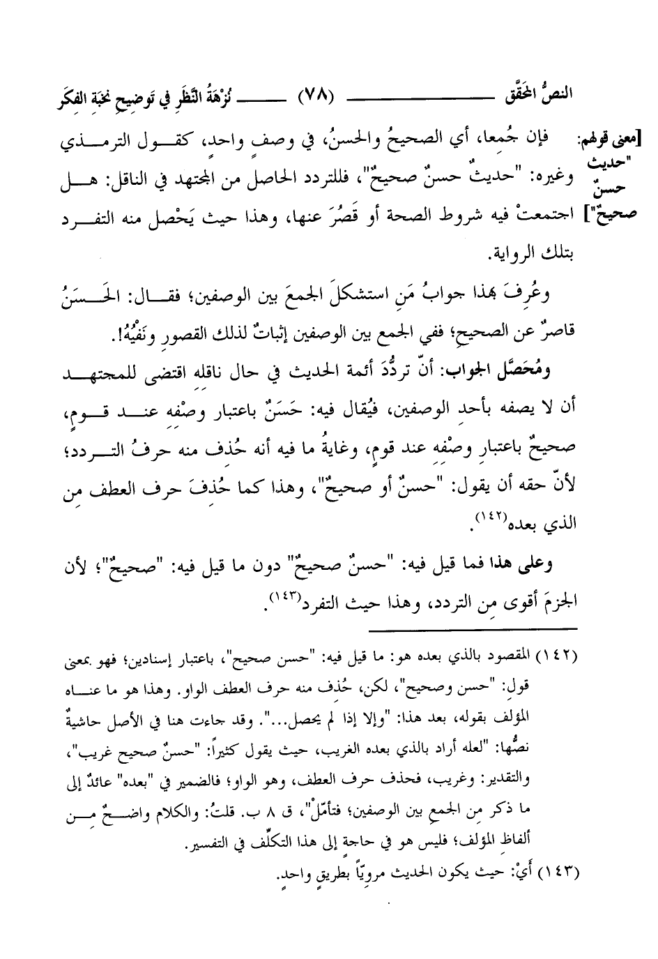وعُرِفَ بهذا جوابُ مَنِ استشكلَ الجمعَ بين الوصفين؛ فقال: الحَسَنُ قاصرٌ عن الصحيحِ؛ ففي الجمع بين الوصفين إثباتٌ لذلك القصورِ ونَفْيُهُ! .