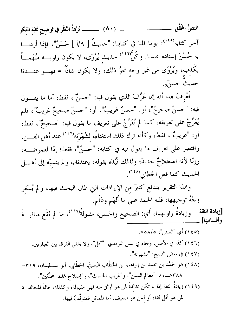 فَعُرِفَ بهذا أنه إنما عَرَّفَ الذي يقول فيه: "حسنٌ"، فقط، أما ما يقول فيه: "حسنٌ صحيحٌ"، أو: "حسنٌ غريبٌ"، أو: "حسنٌ صحيحٌ غريبٌ"، فلم يُعَرِّجْ على تعريفه، كما لم يُعَرِّجْ على تعريف ما يقول فيه: "صحيحٌ"، فقط، أو: "غريبٌ"، فقط، وكأنه ترك ذلك استغناءً، لِشُهْرَتِه (¬3) عند أهل الفن. واقتصر على تعريف ما يقول فيه في كتابه: "حسنٌ"، فقط؛ إمّا لغموضه، وإمّا لأنه اصطلاحٌ جديدٌ؛ ولذلك قَيَّدَه بقوله: ((عندنا))، ولم ينسِبْه إلى أهل الحديث كما فعل الخطابي (¬4).