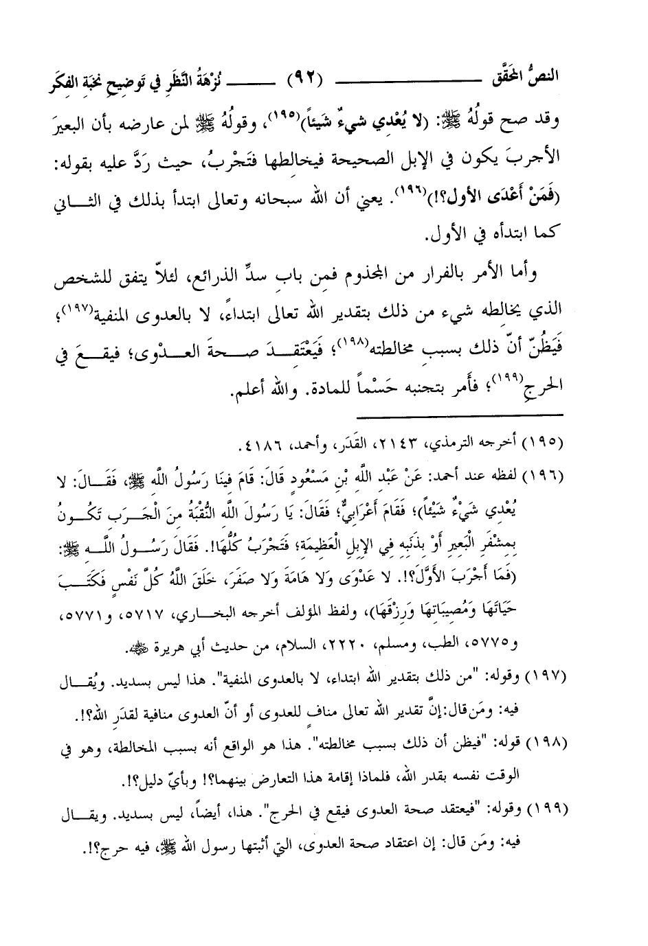 (¬3) وقوله: "من ذلك بتقدير الله ابتداء، لا بالعدوى المنفية". هذا ليس بسديد. ويُقال فيه: ومَن قال: إنَّ تقدير الله تعالى منافٍ للعدوى أو أنّ العدوى منافية لقدَرِ الله؟ ! .