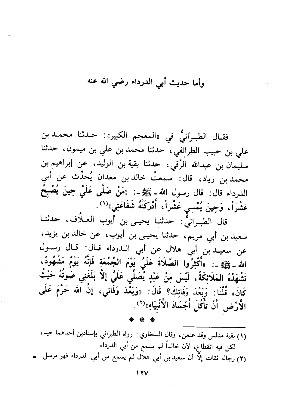 قَالَ الطَّبَرَانِيّ حَدثنَا يحيى بن أَيُّوب العلاف حَدثنَا سعيد بن أبي مَرْيَم حَدثنَا يحيى بن أَيُّوب عَن خَالِد بن يزِيد عَن سعيد بن أبي هِلَال عَن أبي الدَّرْدَاء قَالَ قَالَ رَسُول الله صلى الله عَلَيْهِ وَسلم أَكْثرُوا الصَّلَاة عَليّ يَوْم الْجُمُعَة فَإِنَّهُ يَوْم مشهود تشهده الْمَلَائِكَة لَيْسَ من عبد يُصَلِّي عَليّ إِلَّا بَلغنِي صَوته حَيْثُ كَانَ قُلْنَا وَبعد وفاتك قَالَ وَبعد وفاتي إِن الله حرم على الأَرْض أَن تَأْكُل أجساد الْأَنْبِيَاء