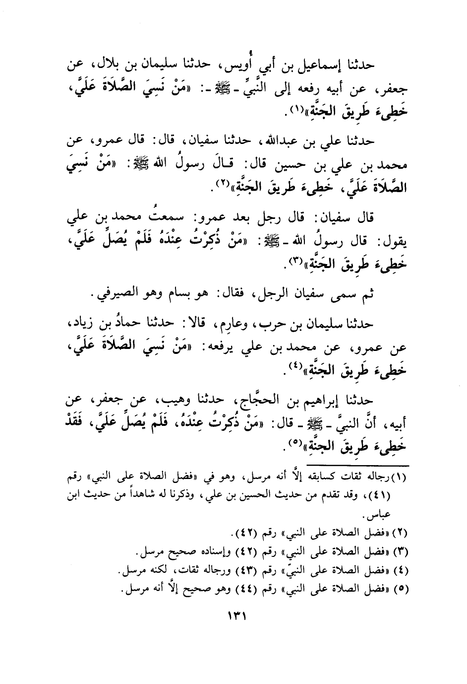 حَدثنَا عَليّ بن عبد الله حَدثنَا سُفْيَان قَالَ قَالَ عَمْرو عَن مُحَمَّد بن عَليّ بن حُسَيْن قَالَ قَالَ رَسُول الله صلى الله عَلَيْهِ وَسلم من نسي الصَّلَاة عَليّ خطئَ طَرِيق الْجنَّة