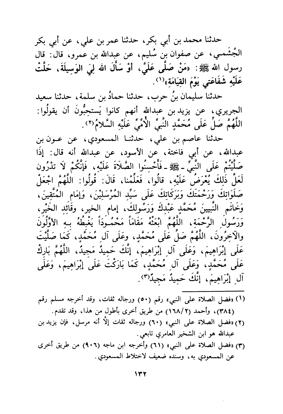 حَدثنَا عَاصِم بن عَليّ حَدثنَا المَسْعُودِيّ عَن عون بن عبد الله عَن أبي فَاخِتَة عَن الْأسود عَن عبد الله أَنه قَالَ إِذا صليتم على النَّبِي صلى الله عَلَيْهِ وَسلم فَأحْسنُوا الصَّلَاة عَلَيْهِ فَإِنَّكُم لَا تَدْرُونَ لَعَلَّ ذَلِك يعرض عَلَيْهِ قَالُوا فَعلمنَا قَالَ قُولُوا اللَّهُمَّ أجعَل صلواتك ورحمتك وبركاتك على سيد الْمُرْسلين وَإِمَام الْمُتَّقِينَ وَخَاتم النَّبِيين مُحَمَّد عَبدك وَرَسُولك إِمَام الْخَيْر وقائد الْخَيْر وَرَسُول الرَّحْمَة اللَّهُمَّ ابعثه مقَاما مَحْمُودًا يغبطه بِهِ الْأَولونَ وَالْآخرُونَ اللَّهُمَّ صل على مُحَمَّد وعَلى آل مُحَمَّد كَمَا صليت على إِبْرَاهِيم وعَلى آل إِبْرَاهِيم إِنَّك حميد مجيد اللَّهُمَّ بَارك على مُحَمَّد وعَلى آل مُحَمَّد كَمَا باركت على إِبْرَاهِيم وعَلى آل إِبْرَاهِيم إِنَّك حميد مجيد