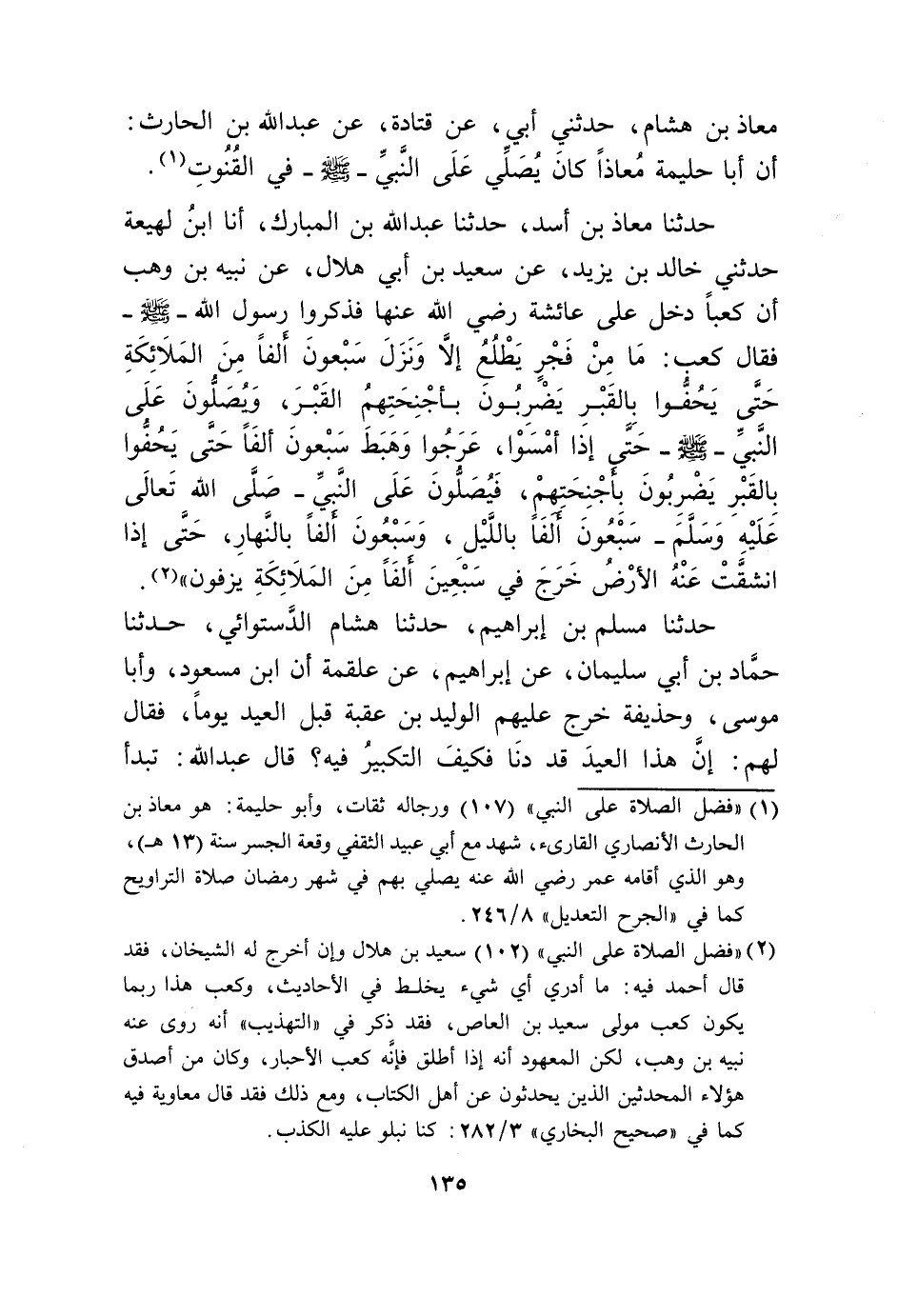 حَدثنَا معَاذ بن أَسد حَدثنَا عبد الله بن الْمُبَارك أَنا ابْن لَهِيعَة حَدثنِي خَالِد بن يزِيد عَن سعيد بن أبي هِلَال عَن نبيه بن وهب أَن كَعْبًا دخل على عَائِشَة رَضِي الله عَنْهَا فَذكرُوا رَسُول الله صلى الله عَلَيْهِ وَسلم فَقَالَ كَعْب مَا من فجر يطلع إِلَّا وَنزل سَبْعُونَ ألفا من الْمَلَائِكَة حَتَّى يحفوا بالقبر يضْربُونَ بأجنحتهم الْقَبْر وَيصلونَ على النَّبِي صلى الله عَلَيْهِ وَسلم حَتَّى إِذا أَمْسوا عرجوا وَهَبَطَ سَبْعُونَ ألفا حَتَّى يحفوا بالقبر يضْربُونَ بأجنحتهم فيصلون على النَّبِي صلى الله عَلَيْهِ وَسلم سَبْعُونَ ألفا بِاللَّيْلِ وَسَبْعُونَ ألفا بِالنَّهَارِ حَتَّى إِذا انشقت عَنهُ الأَرْض خرج فِي سبعين ألفا من الْمَلَائِكَة يزفون