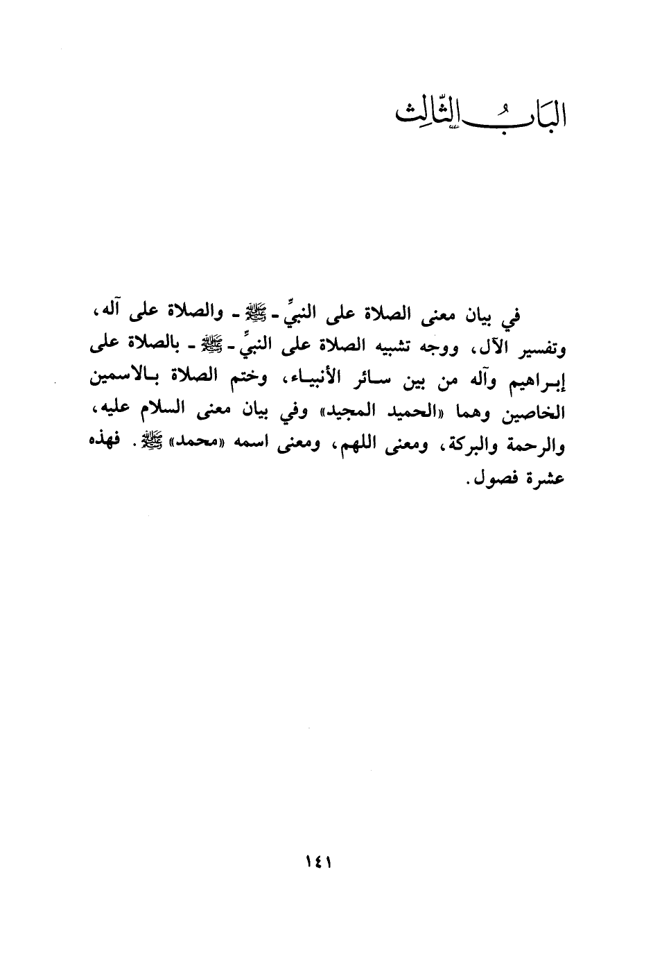 فِي بَيَان معنى الصَّلَاة على النَّبِي صلى الله عَلَيْهِ وَسلم وَالصَّلَاة على آله وَتَفْسِير الْآل وَوجه تَشْبِيه الصَّلَاة على النَّبِي صلى الله عَلَيْهِ وَسلم بِالصَّلَاةِ على إِبْرَاهِيم وَآله من بَين سَائِر الْأَنْبِيَاء وَختم الصَّلَاة بالاسمين الخاصين وهما الحميد الْمجِيد وَفِي بَيَان معنى السَّلَام عَلَيْهِ وَالرَّحْمَة وَالْبركَة وَمعنى اللَّهُمَّ وَمعنى اسْمه مُحَمَّد صلى الله عَلَيْهِ وَسلم فَهَذِهِ عشر فُصُول