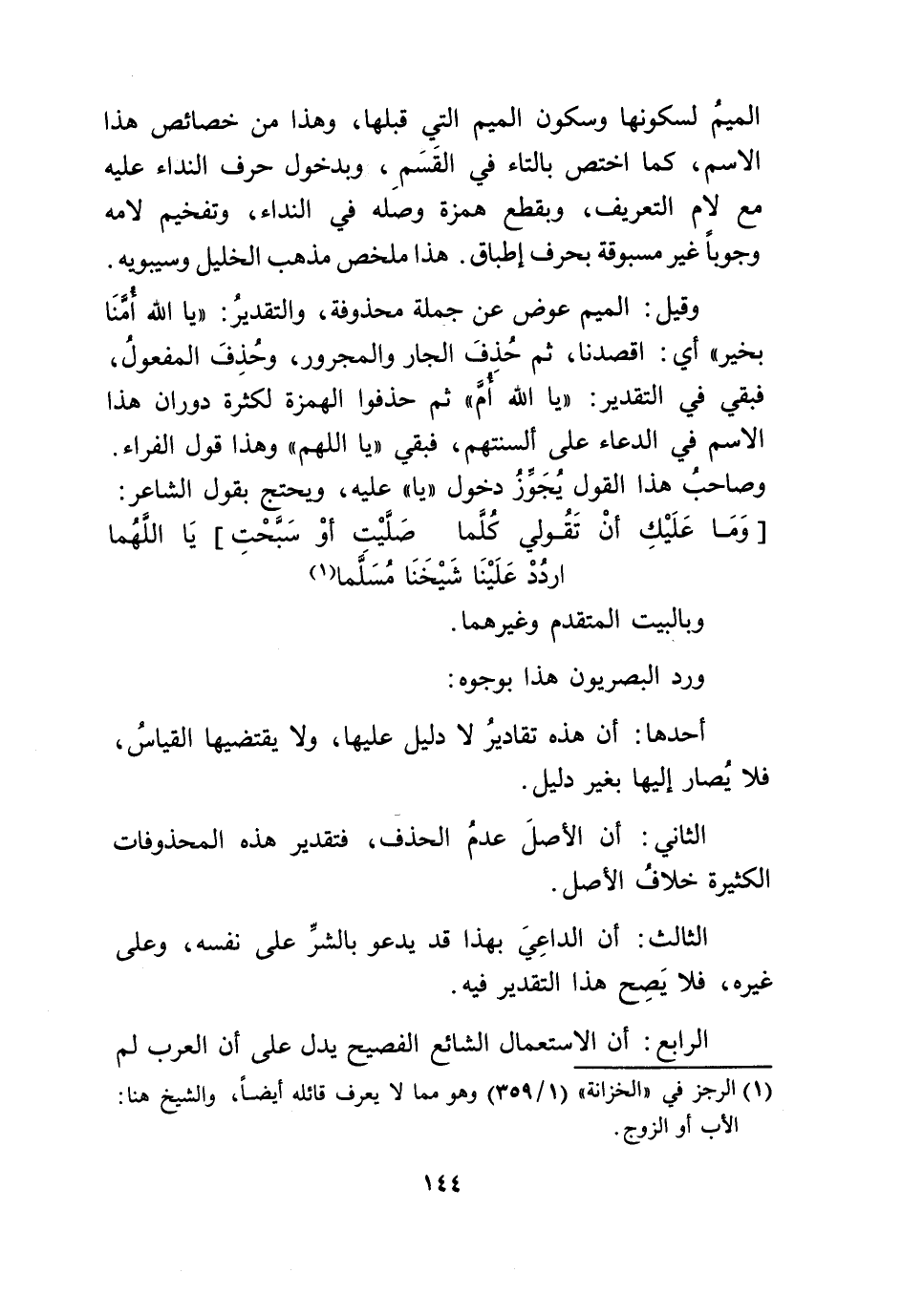 وَقيل الْمِيم عوض عَن جملَة محذوفة وَالتَّقْدِير يَا الله أُمنا بِخَير أَي اقصدنا ثمَّ حذف الْجَار وَالْمَجْرُور وَحذف الْمَفْعُول فَبَقيَ فِي التَّقْدِير يَا الله أُم ثمَّ حذفوا الْهمزَة لِكَثْرَة دوران هَذَا الِاسْم فِي الدُّعَاء على ألسنتهم فَبَقيَ يَا اللَّهُمَّ وَهَذَا قَول الْفراء وَصَاحب هَذَا القَوْل يجوز دُخُول يَا عَلَيْهِ ويحتج بقول الشَّاعِر