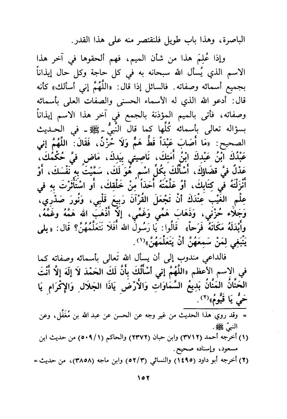وَإِذا علم هَذَا من شَأْن الْمِيم فهم ألحقوها فِي آخر هَذَا الِاسْم الَّذِي يسْأَل الله سُبْحَانَهُ بِهِ فِي كل حَاجَة وكل حَال إِيذَانًا بِجَمِيعِ أَسْمَائِهِ وَصِفَاته فالسائل إِذا قَالَ اللَّهُمَّ إِنِّي أَسأَلك كَأَنَّهُ قَالَ أَدْعُو الله الَّذِي لَهُ الْأَسْمَاء الْحسنى وَالصِّفَات العلى بأسمائه وَصِفَاته فَأتى بِالْمِيم المؤذنة بِالْجمعِ فِي آخر هَذَا الِاسْم إِيذَانًا بسؤاله تَعَالَى بأسمائه كلهَا كَمَا قَالَ النَّبِي صلى الله عَلَيْهِ وَسلم فِي الحَدِيث الصَّحِيح مَا أصَاب عبدا قطّ هم وَلَا حزن فَقَالَ اللَّهُمَّ إِنِّي عَبدك ابْن عَبدك ابْن أمتك ناصيتي بِيَدِك مَاض فِي حكمك عدل فيّ قضاؤك أَسأَلك بِكُل اسْم هُوَ لَك سميت بِهِ نَفسك أَو أنزلته فِي كتابك أَو عَلمته أحدا من خلقك أَو استأثرت بِهِ فِي علم الْغَيْب عنْدك أَن تجْعَل الْقُرْآن ربيع قلبِي وَنور صَدْرِي وجلاء حزني وَذَهَاب همي وغمي إِلَّا أذهب الله همه وغمه وأبدله مَكَانَهُ فَرحا قَالُوا يَا رَسُول الله أَفلا نتعلمهن قَالَ بلَى يَنْبَغِي لمن سمعهن أَن يتعلمهن // إِسْنَاده صَحِيح //