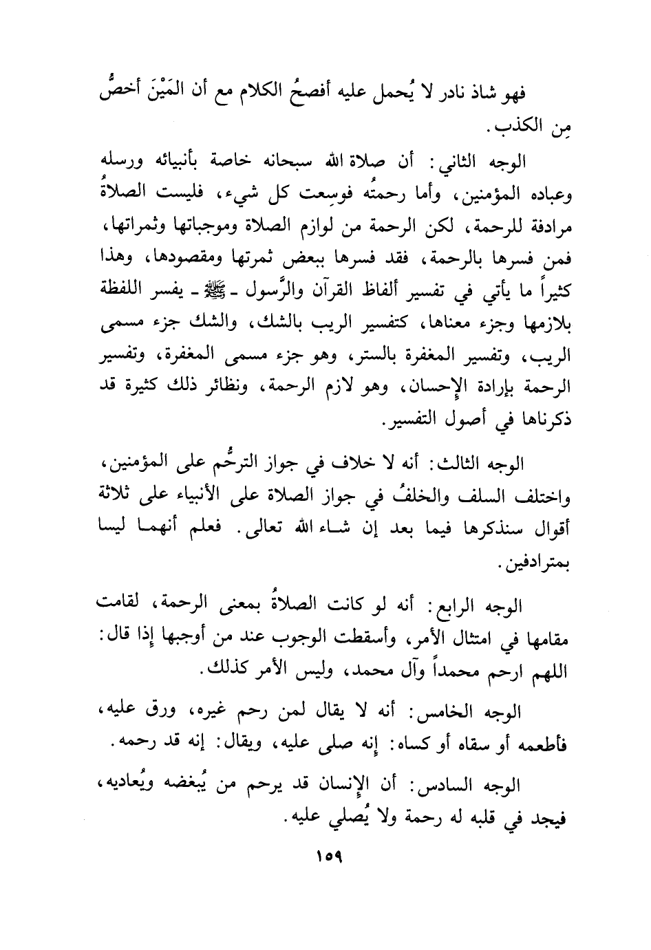 الْوَجْه الرَّابِع أَنه لَو كَانَت الصَّلَاة بِمَعْنى الرَّحْمَة لقامت مقَامهَا فِي امْتِثَال الْأَمر وأسقطت الْوُجُوب عِنْد من أوجبهَا إِذا قَالَ اللَّهُمَّ ارْحَمْ مُحَمَّدًا وَآل مُحَمَّد وَلَيْسَ الْأَمر كَذَلِك