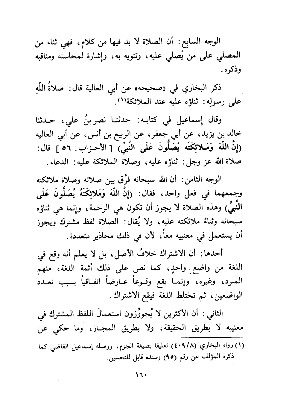 الْوَجْه الثَّامِن أَن الله سُبْحَانَهُ فرق بَين صلَاته وَصَلَاة مَلَائكَته وجمعهما فِي فعل وَاحِد فَقَالَ {إِن الله وَمَلَائِكَته يصلونَ على النَّبِي} وَهَذِه الصَّلَاة لَا يجوز أَن تكون هِيَ الرَّحْمَة وَإِنَّمَا هِيَ ثَنَاؤُهُ سُبْحَانَهُ وثناء مَلَائكَته عَلَيْهِ وَلَا يُقَال الصَّلَاة لفظ مُشْتَرك وَيجوز أَن يسْتَعْمل فِي معنييه مَعًا لِأَن فِي ذَلِك محاذير مُتعَدِّدَة