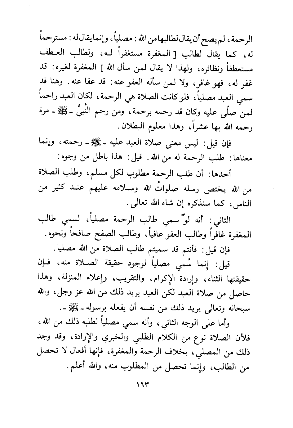 الرَّحْمَة لم يَصح أَن يُقَال لطالبها من الله مُصَليا وَإِنَّمَا يُقَال لَهُ مسترحما لَهُ كَمَا يُقَال لطَالب الْمَغْفِرَة مُسْتَغْفِرًا لَهُ ولطالب الْعَطف مستعطفا ونظائره وَلِهَذَا لَا يُقَال لمن سَأَلَ الله الْمَغْفِرَة لغيره قد غفر لَهُ فَهُوَ غَافِر وَلَا لمن سَأَلَهُ الْعَفو عَنهُ قد عَفا عَنهُ وَهنا قد سمي العَبْد مُصَليا فَلَو كَانَت الصَّلَاة هِيَ الرَّحْمَة لَكَانَ العَبْد راحما لمن صلى عَلَيْهِ وَكَانَ قد رَحمَه برحمة وَمن رحم النَّبِي صلى الله عَلَيْهِ وَسلم مرّة رَحمَه الله بهَا عشرا وَهَذَا مَعْلُوم الْبطلَان