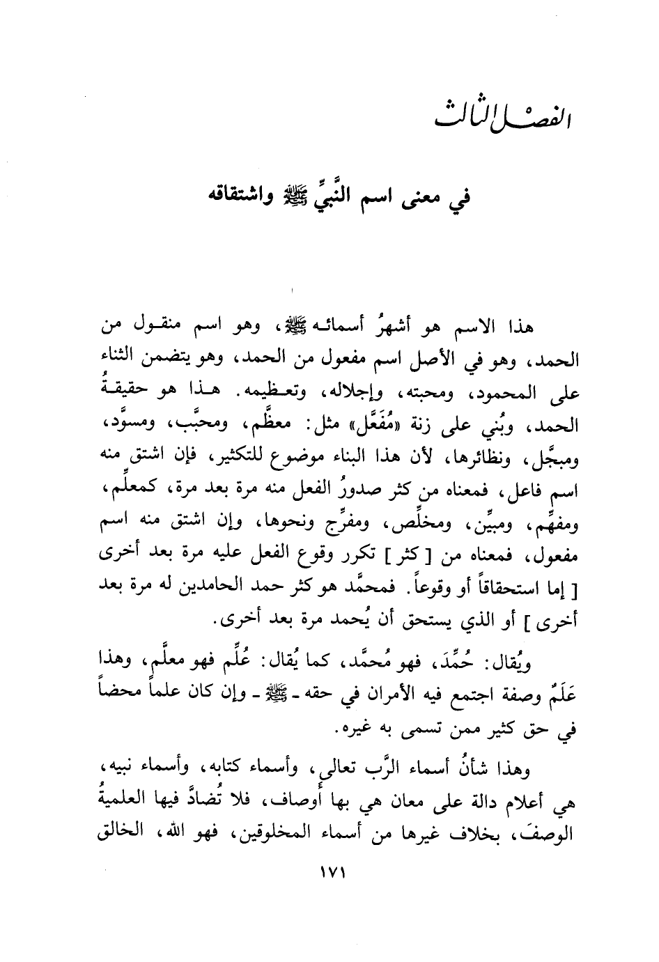 هَذَا إِلَّا سم هُوَ أشهر أَسْمَائِهِ صلى الله عَلَيْهِ وَسلم وَهُوَ اسْم مَنْقُول من الْحَمد وَهُوَ فِي الأَصْل اسْم مفعول من الْحَمد وَهُوَ يتَضَمَّن الثَّنَاء على الْمَحْمُود ومحبته وإجلاله وتعظيمه هَذَا هُوَ حَقِيقَة الْحَمد وَبني على زنة مفعل مثل مُعظم ومحبب ومسود ومبجل ونظائرها لِأَن هَذَا الْبناء مَوْضُوع للتكثير فَإِن اشتق مِنْهُ اسْم فَاعل فَمَعْنَاه من كثر صُدُور الْفِعْل مِنْهُ مرّة بعد مرّة كمعلم ومفهم ومبين ومخلص ومفرج وَنَحْوهَا وَإِن اشتق مِنْهُ اسْم مفعول فَمَعْنَاه من كثر تكَرر وُقُوع الْفِعْل عَلَيْهِ مرّة بعد أُخْرَى إِمَّا استحقاقاً أَو وقوعاً فمحمد هُوَ كثر حمد الحامدين لَهُ مرّة بعد أُخْرَى أَو الَّذِي يسْتَحق أَن يحمد مرّة بعد أُخْرَى
