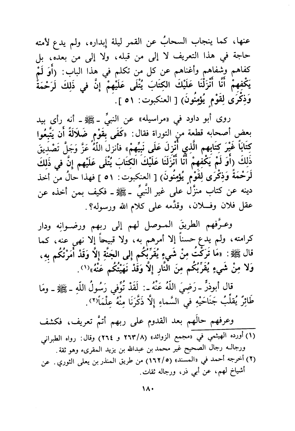 روى أَبُو دَاوُد فِي مراسيله عَن النَّبِي صلى الله عَلَيْهِ وَسلم أَنه رأى بيد بعض أَصْحَابه قِطْعَة من التَّوْرَاة فَقَالَ كفى بِقوم ضَلَالَة أَن يتبعوا كتابا غير كِتَابهمْ الَّذِي أنزل على نَبِيّهم فَأنْزل الله عز وَجل تَصْدِيق ذَلِك {أَو لم يَكْفِهِمْ أَنَّا أَنْزَلْنَا عَلَيْكَ الْكِتَابَ يُتْلَى عَلَيْهِمْ إِنَّ فِي ذَلِكَ لَرَحْمَةً وَذِكْرَى لِقَوْمٍ يُؤْمِنُونَ} العنكبوت 51 فَهَذَا حَال من أَخذ دينه عَن كتاب منزل على غير النَّبِي صلى الله عَلَيْهِ وَسلم فَكيف بِمن أَخذه عَن عقل فلَان وَفُلَان وَقدمه على كَلَام الله وَرَسُوله