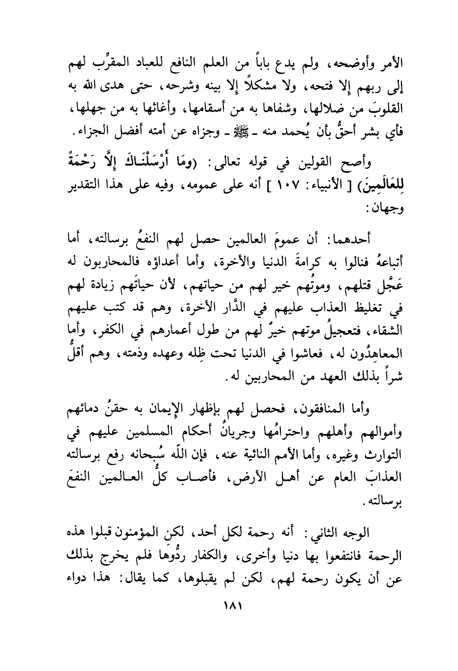 أَحدهمَا أَن عُمُوم الْعَالمين حصل لَهُم النَّفْع برسالته أما أَتْبَاعه فنالوا بِهِ كَرَامَة الدُّنْيَا وَالْآخِرَة وَأما أعداؤه فالمحاربون لَهُ عجل قَتلهمْ وموتهم خير لَهُم من حياتهم لِأَن حياتهم زِيَادَة لَهُم فِي تَغْلِيظ الْعَذَاب عَلَيْهِم فِي الدَّار الْآخِرَة وهم قد كتب عَلَيْهِم الشَّقَاء فتعجيل مَوْتهمْ خير لَهُم من طول أعمارهم فِي الْكفْر وَأما المعاهدون لَهُ فعاشوا فِي الدُّنْيَا تَحت ظله وَعَهده وذمته وهم أقل شرا بذلك الْعَهْد من الْمُحَاربين لَهُ