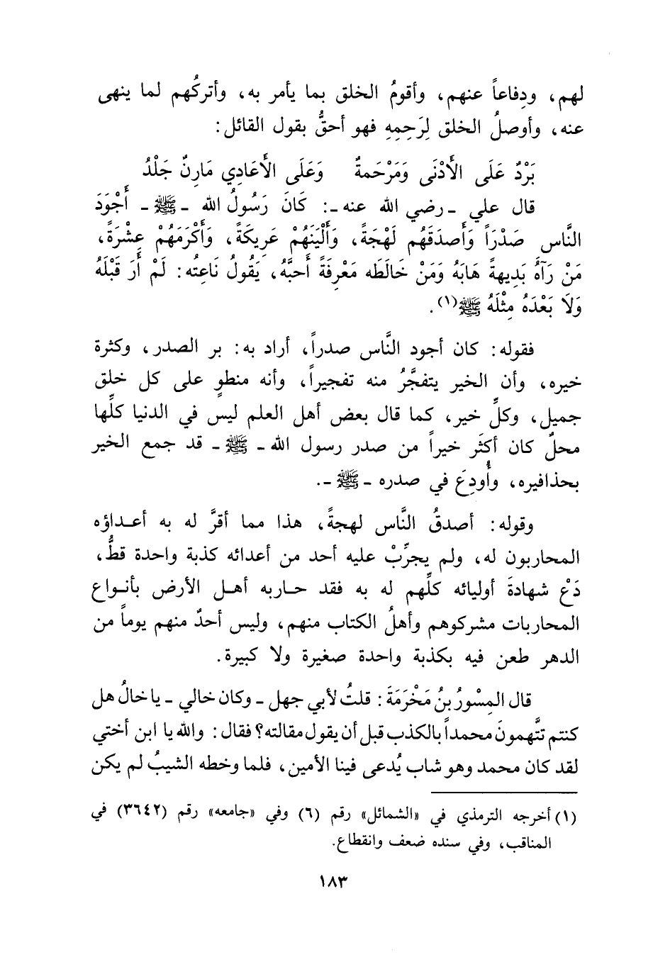 قَالَ عَليّ رَضِي الله عَنهُ كَانَ رَسُول الله صلى الله عَلَيْهِ وَسلم أَجود النَّاس صَدرا وأصدقهم لهجة وألينهم عَرِيكَة وَأكْرمهمْ عشرَة من رَآهُ بديهة هابه وَمن خالطه معرفَة أحبه يَقُول ناعته لم أر قبله وَلَا بعده مثله صلى الله عَلَيْهِ وَسلم