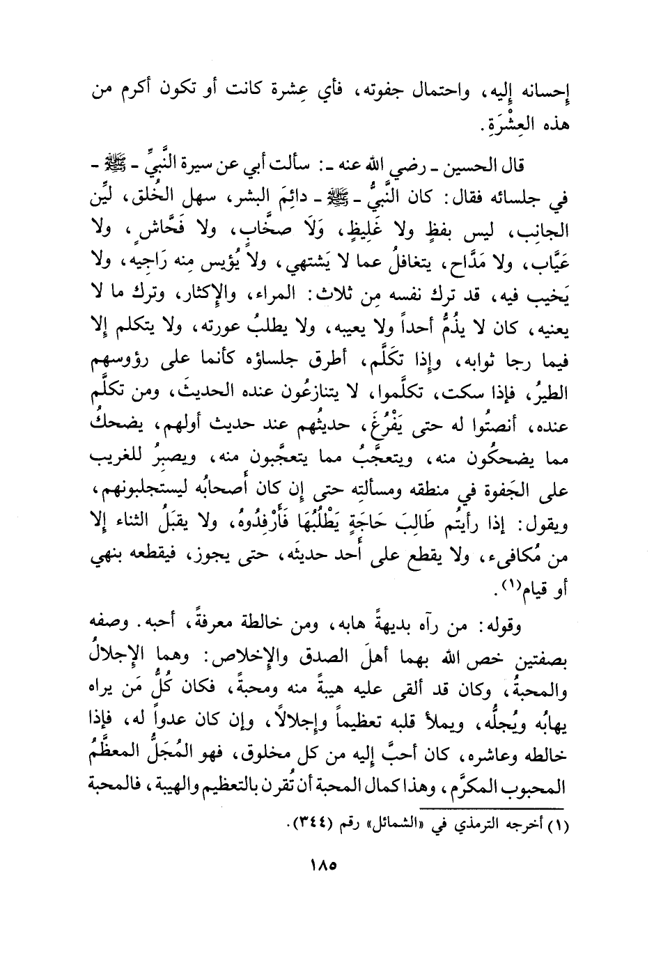 قَالَ الْحُسَيْن رَضِي الله عَنهُ سَأَلت أبي عَن سيرة النَّبِي صلى الله عَلَيْهِ وَسلم فِي جُلَسَائِهِ فَقَالَ كَانَ النَّبِي صلى الله عَلَيْهِ وَسلم دَائِم الْبشر سهل الْخلق لين الْجَانِب لَيْسَ بِفَظٍّ وَلَا غليظ وَلَا صخاب وَلَا فحاش وَلَا عياب وَلَا مداح يتغافل عَمَّا لَا يَشْتَهِي وَلَا يؤيس مِنْهُ راجيه وَلَا يخيب فِيهِ قد ترك نَفسه من ثَلَاث المراء والإكثار وَترك مَا لَا يعنيه كَانَ لَا يذم أحدا وَلَا يعِيبهُ وَلَا يطْلب عَوْرَته وَلَا يتَكَلَّم إِلَّا فِيمَا رجا ثَوَابه وَإِذا تكلم أطرق جُلَسَاؤُهُ كَأَنَّمَا على رؤوسهم الطير فَإِذا سكت تكلمُوا لَا يتنازعون عِنْده الحَدِيث وَمن تكلم عِنْده أَنْصتُوا لَهُ حَتَّى يفرغ حَدِيثهمْ عِنْد حَدِيث أَوَّلهمْ يضْحك مِمَّا يَضْحَكُونَ مِنْهُ ويتعجب مِمَّا يتعجبون مِنْهُ ويصبر للغريب على الجفوة فِي مَنْطِقه ومسألته حَتَّى إِن كَانَ أَصْحَابه ليستجلبونهم وَيَقُول إِذا رَأَيْتُمْ طَالب حَاجَة يطْلبهَا فأرفدوه وَلَا يقبل الثَّنَاء إِلَّا من مكافئ وَلَا يقطع على أحد حَدِيثه حَتَّى يجوز فيقطعه بنهي أَو قيام