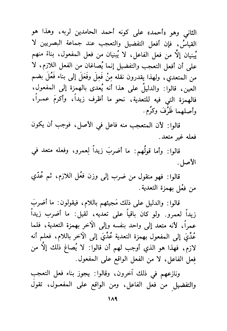 الثَّانِي وَهُوَ أَحْمد على كَونه أَحْمد الحامدين لرَبه وَهَذَا هُوَ الْقيَاس فَإِن أفعل التَّفْضِيل والتعجب عِنْد جمَاعَة الْبَصرِيين لَا يبنيان إِلَّا من فعل الْفَاعِل لَا يبنيان من فعل الْمَفْعُول بِنَاء مِنْهُم على أَن أفعل التَّعَجُّب والتفضيل إِنَّمَا يصاغان من الْفِعْل اللَّازِم لَا من الْمُتَعَدِّي وَلِهَذَا يقدرُونَ نَقله من فعل وَفعل إِلَى بِنَاء فعل بِضَم الْعين قَالُوا وَالدَّلِيل على هَذَا أَنه يعدى بِالْهَمْزَةِ إِلَى الْمَفْعُول فالهمزة الَّتِي فِيهِ للتعدية نَحْو مَا أظرف زيدا وَأكْرم عمرا وأصلهما ظرف وكرم