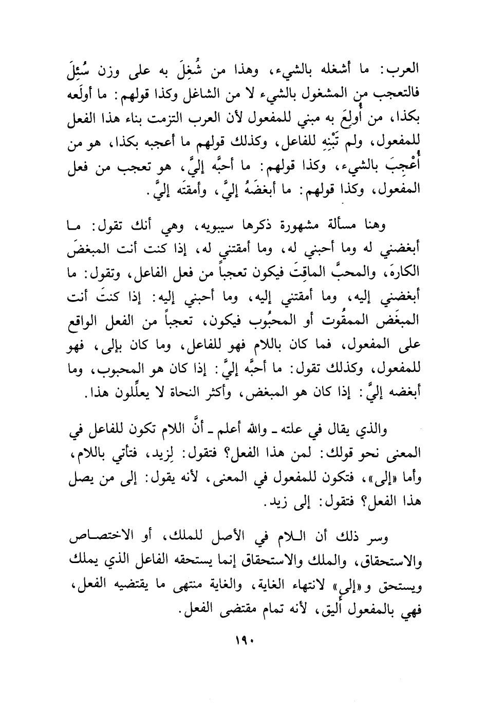 الْعَرَب مَا أشغله بالشَّيْء وَهَذَا من شغل بِهِ على وزن سُئِلَ فالتعجب من المشغول بالشَّيْء لَا من الشاغل وَكَذَا قَوْلهم مَا أولعه بِكَذَا من أولع بِهِ مَبْنِيّ للْمَفْعُول لِأَن الْعَرَب التزمت بِنَاء هَذَا الْفِعْل للْمَفْعُول وَلم تبنه للْفَاعِل وَكَذَلِكَ قَوْلهم مَا أعجبه بِكَذَا هُوَ من أعجب بالشَّيْء وَكَذَا قَوْلهم مَا أحبه إِلَيّ هُوَ تعجب من فعل الْمَفْعُول وَكَذَا قَوْلهم مَا أبغضه إِلَيّ وأمقته إِلَيّ