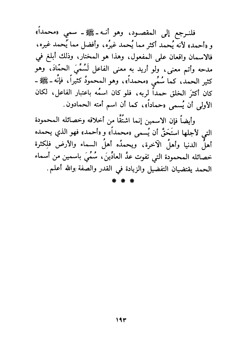 فلنرجع إِلَى الْمَقْصُود وَهُوَ أَنه صلى الله عَلَيْهِ وَسلم سمي مُحَمَّدًا وَأحمد لِأَنَّهُ يحمد أَكثر مِمَّا يحمد غَيره وَأفضل مِمَّا يحمد غَيره فالاسمان واقعان على الْمَفْعُول وَهَذَا هُوَ الْمُخْتَار وَذَلِكَ أبلغ فِي مدحه وَأتم معنى وَلَو أُرِيد بِهِ معنى الْفَاعِل لسمي الحماد وَهُوَ كثير الْحَمد كَمَا سمي مُحَمَّدًا وَهُوَ الْمَحْمُود كثيرا فَإِنَّهُ صلى الله عَلَيْهِ وَسلم كَانَ أَكثر الْخلق حمداً لرَبه فَلَو كَانَ اسْمه بِاعْتِبَار الْفَاعِل لَكَانَ الأولى أَن يُسمى حماداً كَمَا أَن اسْم أمته الْحَمَّادُونَ