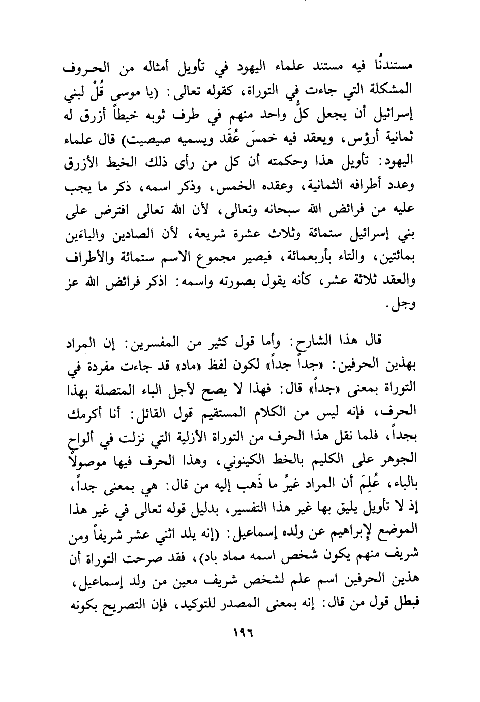 مستندنا فِيهِ مُسْتَند عُلَمَاء الْيَهُود فِي تَأْوِيل أَمْثَاله من الْحُرُوف المشكلة الَّتِي جَاءَت فِي التَّوْرَاة كَقَوْلِه تَعَالَى يَا مُوسَى قل لبني إِسْرَائِيل أَن يَجْعَل كل وَاحِد مِنْهُم فِي طرف ثَوْبه خيطاً أَزْرَق لَهُ ثَمَانِيَة أرؤس ويعقد فِيهِ خمس عقد ويسميه صيصيت قَالَ عُلَمَاء الْيَهُود تَأْوِيل هَذَا وحكمته أَن كل من رأى ذَلِك الْخَيط الْأَزْرَق وَعدد أَطْرَافه الثَّمَانِية وعقده الْخمس وَذكر اسْمه ذكر مَا يجب عَلَيْهِ من فَرَائض الله سُبْحَانَهُ وَتَعَالَى لِأَن الله تَعَالَى افْترض على بني إِسْرَائِيل سِتّمائَة وَثَلَاث عشرَة شَرِيعَة لِأَن الصادين والياءين بمائتين وَالتَّاء بأربعمائة فَيصير مَجْمُوع الِاسْم سِتّمائَة والأطراف وَالْعقد ثَلَاثَة عشر كَأَنَّهُ يَقُول بصورته واسْمه اذكر فَرَائض الله عز وَجل