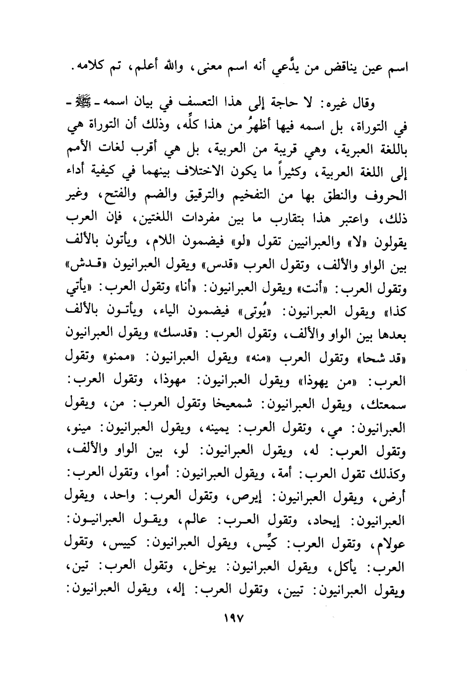 وَقَالَ غَيره لَا حَاجَة إِلَى هَذَا التعسف فِي بَيَان اسْمه صلى الله عَلَيْهِ وَسلم فِي التَّوْرَاة بل اسْمه فِيهَا أظهر من هَذَا كُله وَذَلِكَ أَن التَّوْرَاة هِيَ باللغة العبرية وَهِي قريبَة من الْعَرَبيَّة بل هِيَ أقرب لُغَات الْأُمَم إِلَى اللُّغَة الْعَرَبيَّة وَكَثِيرًا مَا يكون الِاخْتِلَاف بَينهمَا فِي كَيْفيَّة أَدَاء الْحُرُوف والنطق بهَا من التفخيم والترقيق وَالضَّم وَالْفَتْح وَغير ذَلِك وَاعْتبر هَذَا بتقارب مَا بَين مُفْرَدَات اللغتين فَإِن الْعَرَب يَقُولُونَ لَا والعبرانيين تَقول لَو فيضمون اللَّام ويأتون بِالْألف بَين الْوَاو وَالْألف وَتقول الْعَرَب قدس وَيَقُول العبرانيون قدش وَتقول الْعَرَب أَنْت وَيَقُول العبرانيون أَنا وَتقول الْعَرَب يَأْتِي كَذَا وَيَقُول العبرانيون يوتى فيضمون الْيَاء ويأتون بِالْألف بعْدهَا بَين الْوَاو وَالْألف وَتقول الْعَرَب قدسك وَيَقُول العبرانيون قد شحا وَتقول الْعَرَب مِنْهُ وَيَقُول العبرانيون ممنو وَتقول الْعَرَب من يهوذا وَيَقُول العبرانيون مهوذا وَتقول الْعَرَب سَمِعتك وَيَقُول العبرانيون شمعيخا وَتقول الْعَرَب من وَيَقُول العبرانيون مي وَتقول الْعَرَب يَمِينه وَيَقُول العبرانيون مينو وَتقول الْعَرَب لَهُ وَيَقُول العبرانيون لَو بَين الْوَاو وَالْألف وَكَذَلِكَ تَقول الْعَرَب أمة وَيَقُول العبرانيون أموا وَتقول الْعَرَب أَرض وَيَقُول العبرانيون إيرص وَتقول الْعَرَب وَاحِد وَيَقُول العبرانيون إيحاد وَتقول الْعَرَب عَالم وَيَقُول العبرانيون عولام وَتقول الْعَرَب كيس وَيَقُول العبرانيون كييس وَتقول الْعَرَب يَأْكُل وَيَقُول العبرانيون يوخل وَتقول الْعَرَب تين وَيَقُول العبرانيون تيين وَتقول الْعَرَب إِلَه وَيَقُول العبرانيون