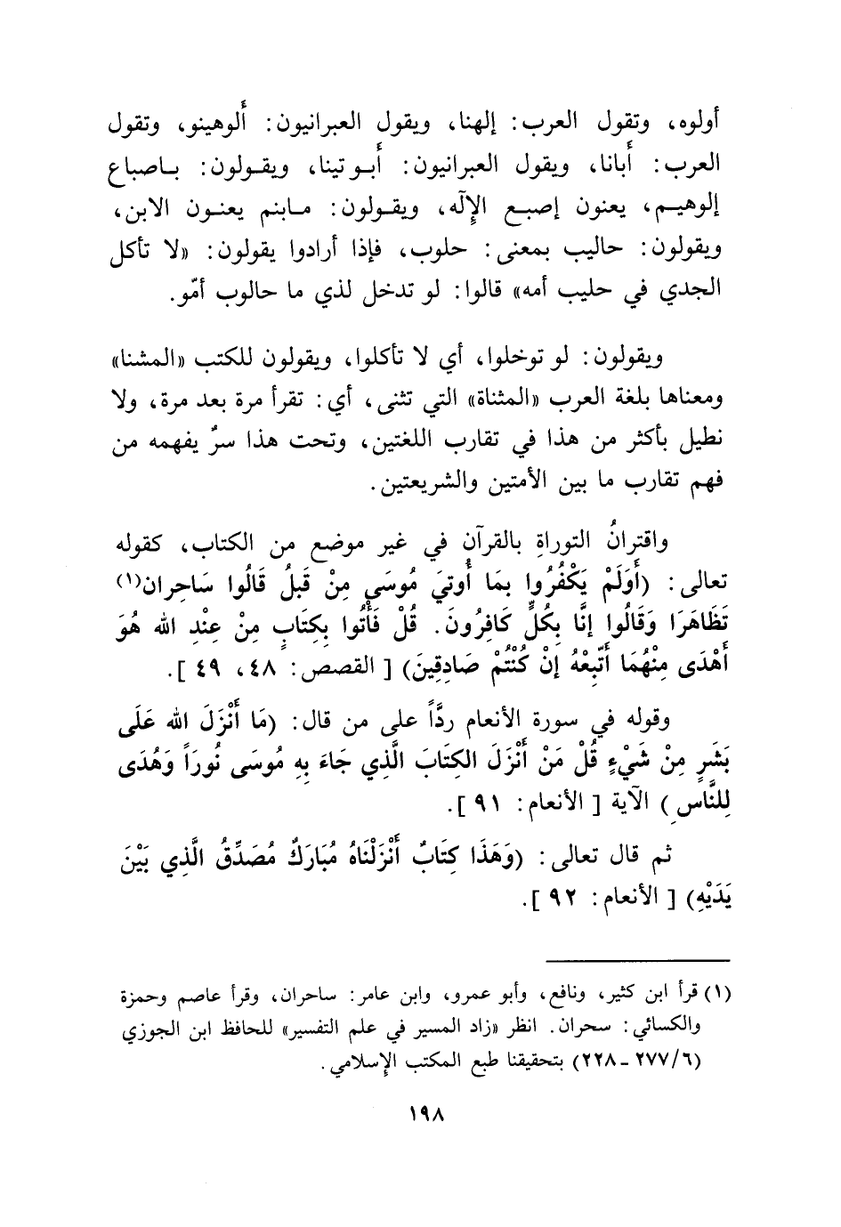 واقتران التَّوْرَاة بِالْقُرْآنِ فِي غير مَوضِع من الْكتاب كَقَوْلِه تَعَالَى {أَو لم يكفروا بِمَا أُوتِيَ مُوسَى من قبل قَالُوا سحران تظاهرا وَقَالُوا إِنَّا بِكُل كافرون قُلْ فَأْتُوا بِكِتَابٍ من عِنْد الله هُوَ أَهْدَى مِنْهُمَا أَتَّبِعْهُ إِنْ كُنْتُمْ صَادِقِينَ} الْقَصَص 48 49
